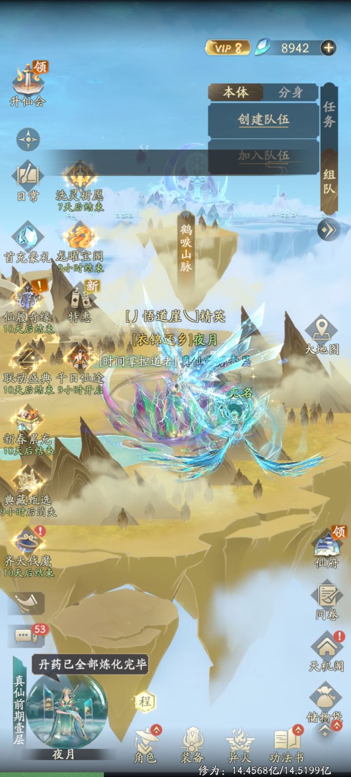 从24年10月1日接触游戏开始,到1月16日开始开天门,再到2月16日飞升成功,刚好是除夕这一天一年多过来,好多人都退游了,每个服剩下的人不是很多,自己也是就坚持着每日做下日常,参与一下跨服活动就没了,中午的魔祖、晚上的灵泉和镇邪也不知何时起懒得准点参与了(凑巧在线就去蹭一下灵石),白嫖玩家能蹭到前64也是满足了(不止一个服),虽然飞升后属性还是挺低的(大佬们都是我百倍千倍的属性)