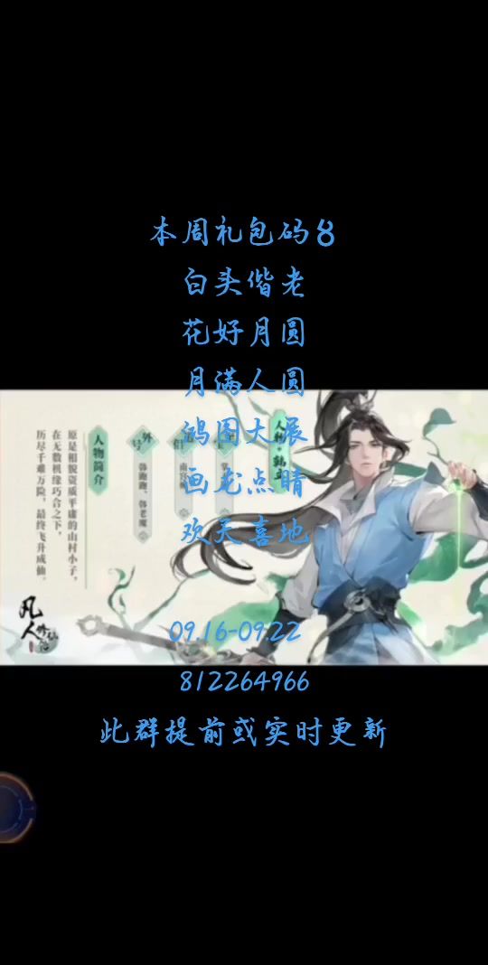 本周礼包码〥 白头偕老 花好月圆 月满人圆 鸿图大展 画龙点睛 欢天喜地 09.16-09.22 812264966 此群提前或实时更新#凡人修仙传人界篇 #凡人修仙传人界篇更新 #凡人修仙传人界篇兑换码 #凡人修仙传人界篇攻略