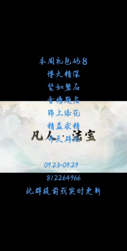 本周礼包码〥 博大精深 坚如磐石 金榜题名 锦上添花 精益求精 开天辟地 09.23-09.29 812264966 此群提前或实时更新 #凡人修仙传人界篇 #凡人修仙传人界篇兑换码 #凡人修仙传人界篇更新 #凡人修仙传人界篇攻略