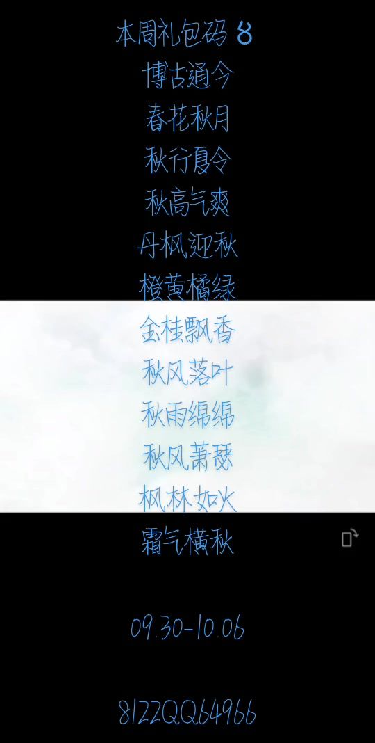 本周礼包码〥 博古通今 春花秋月 秋行夏令 秋高气爽 丹枫迎秋 橙黄橘绿 金桂飘香 秋风落叶 秋雨绵绵 秋风萧瑟 枫林如火 霜气横秋 09.30-10.06 8122QQ64966#凡人修仙传人界篇 #凡人修仙传人界篇攻略 #凡人修仙传人界篇兑换码
