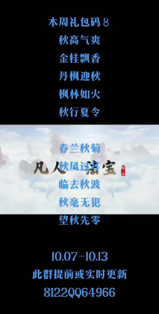 本周礼包码〥 秋高气爽 金桂飘香 丹枫迎秋 枫林如火 秋行夏令 春兰秋菊 秋风过耳 临去秋波 秋毫无犯 望秋先零 10.07-10.13 此群提前或实时更新 8122QQ64966#凡人修仙传人界篇 #凡人修仙传人界篇兑换码 #凡人修仙传人界篇攻略