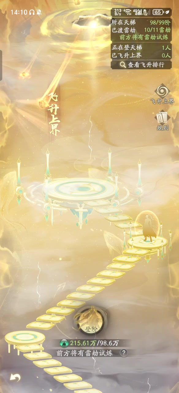 由于我是本位面唯一一个在爬天梯的,现在在预约飞升,然后可能是因为找不到道友,导致现在无法继续[表情_疑惑]一旦我现在进入这个页面,游戏直接进入死循环,不能继续操作,只能退出游戏重进[表情_嫌弃]