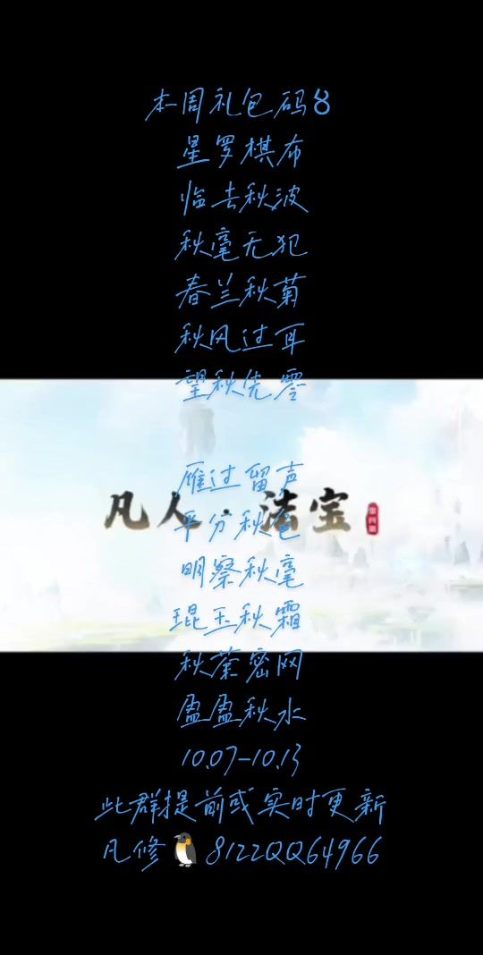 本周礼包码〥 星罗棋布 临去秋波 秋毫无犯 春兰秋菊 秋风过耳 望秋先零 雁过留声 平分秋色 明察秋毫 琨玉秋霜 秋荼密网 盈盈秋水 10.07-10.13#凡人修仙传人界篇 #凡人修仙传人界篇攻略 #凡人修仙传人界篇兑换码 #凡人修仙传人界篇更新