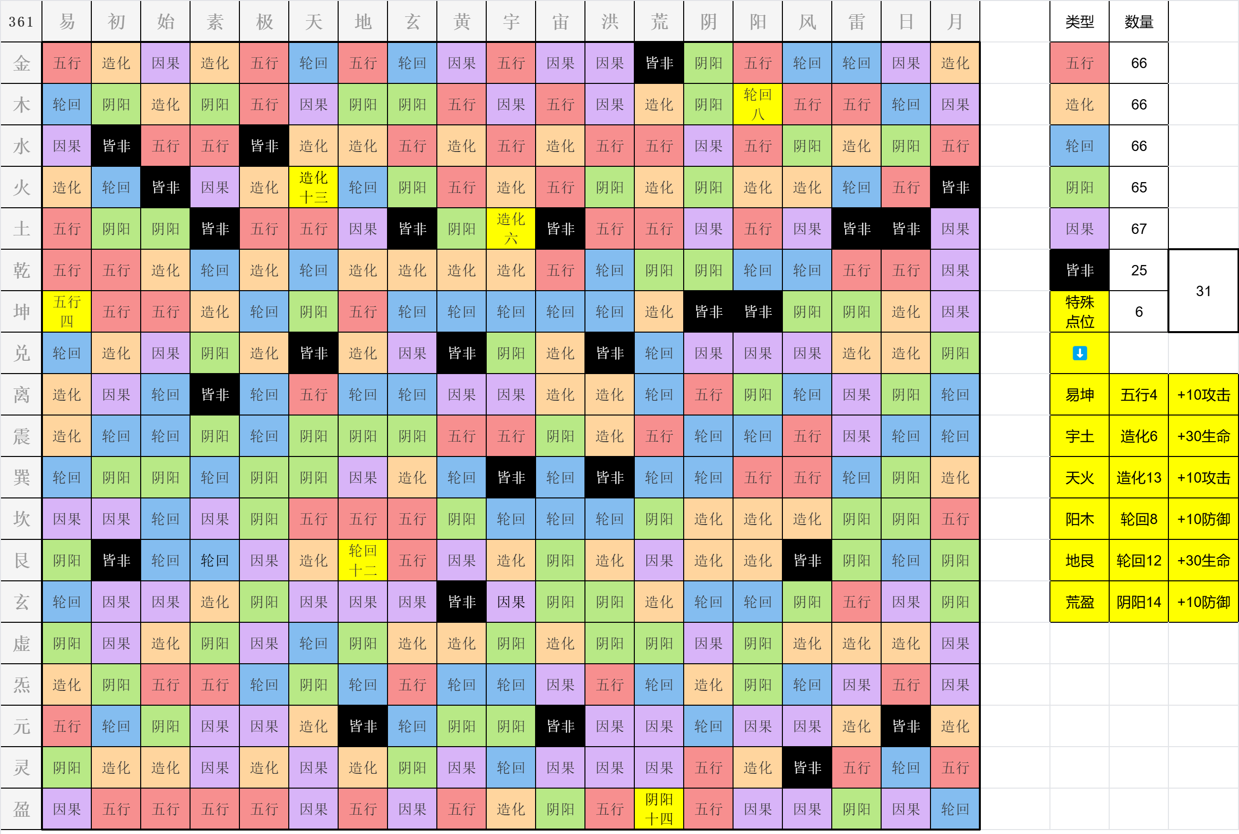 大道本元落子对应:竖排19个位置对应,目前发现的属性只有攻击,防御,生命,后续根据修改,横向易初始素极天地玄黄宇宙洪荒阴阳风雷日月落子对应名称, 易初始素极天地玄黄宇宙洪荒(造化之道)—(因果之道)—(轮回之道) 阴阳(阴阳之道) 风雷日月(因果之道)— 金木水火土(五行之道) 以上根据个人推测以及评论补充,总结了一下大道名称没有规律,只能根据你的属性去找对应的落点 后续欢迎各位道友补充以及修改纠