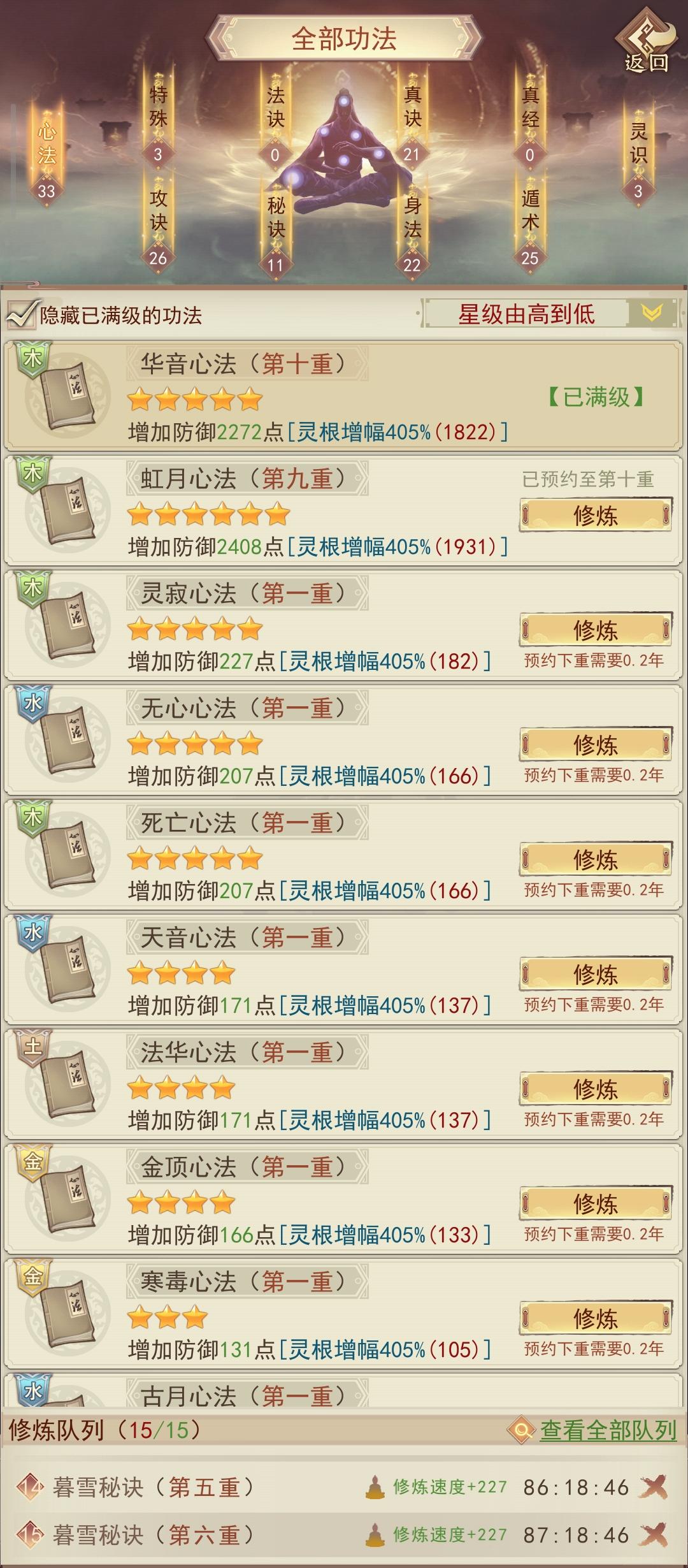 已经选择了星级由高到低顺序排,但是页面上六星还是排在一星的后面,看着很难受。以及,能不能出一个功能选择隐藏某某星级的功法,有些早期的功法不会去练了但是还在列表里,想给它隐藏掉。