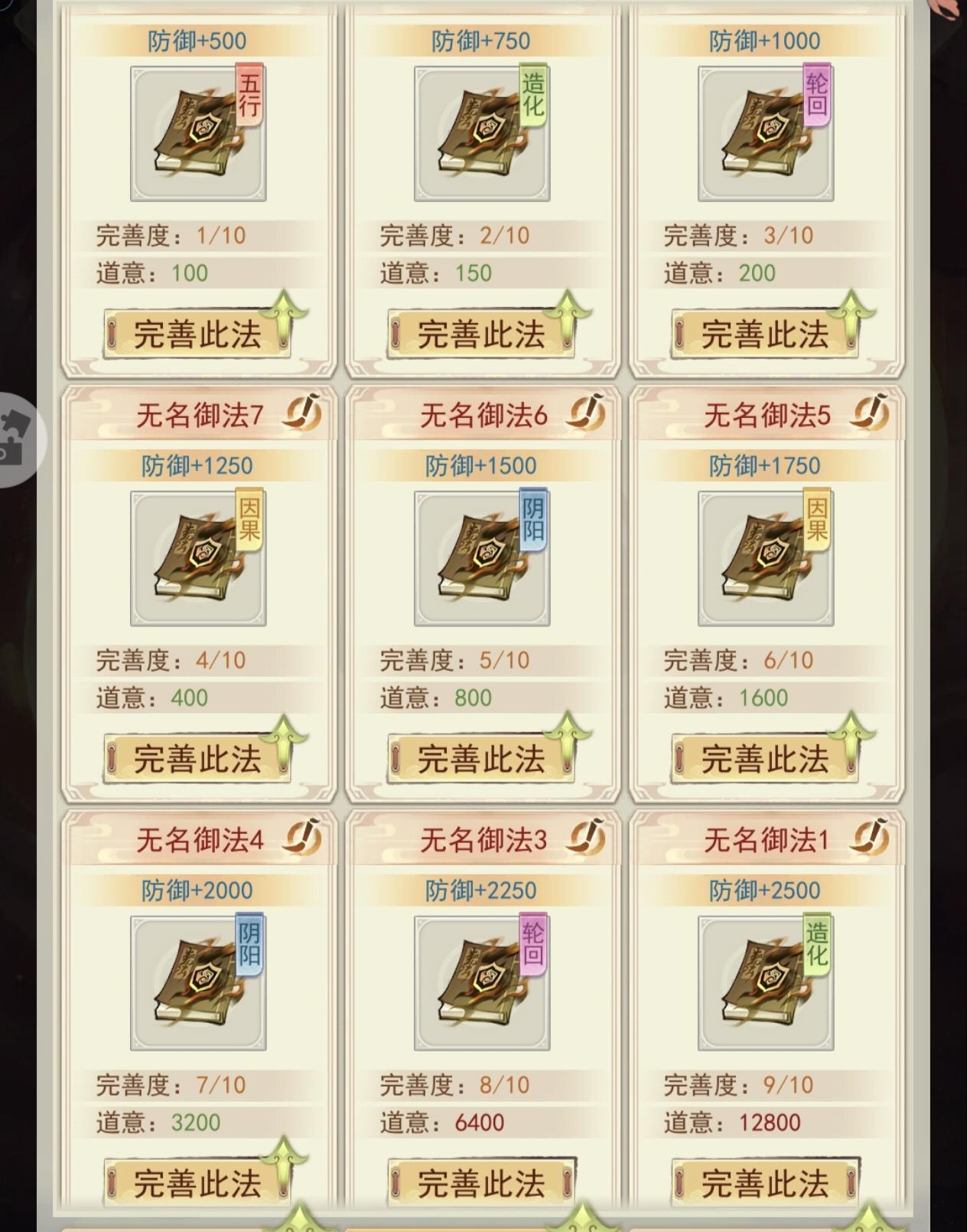 攻击、防御荒法初始加500(生命荒法属性加成为防御的3倍),每升一级加250,满级为500+250*9=2750一个荒法满级消耗道意共计100+150+200+400+800+1600+3200+6400+12800=25650