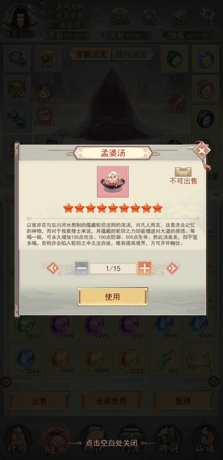 修真无岁月,转眼又万年。不知不觉中修真已有83883年了,练习时长也有两年半了。作为一个零氪,能坚持到现在除了群友的陪伴之外,就是想看看自己能否熬到帝仙,届时属性又如何?没想到最终竟实现了。在此记录一下自己的修仙历程。0年,练气4年,筑基11年,金丹73年,元婴350年,出窍819年,分神1271年,合体2102年,洞虚3218年,大乘4470年,洞真6001年,散仙8