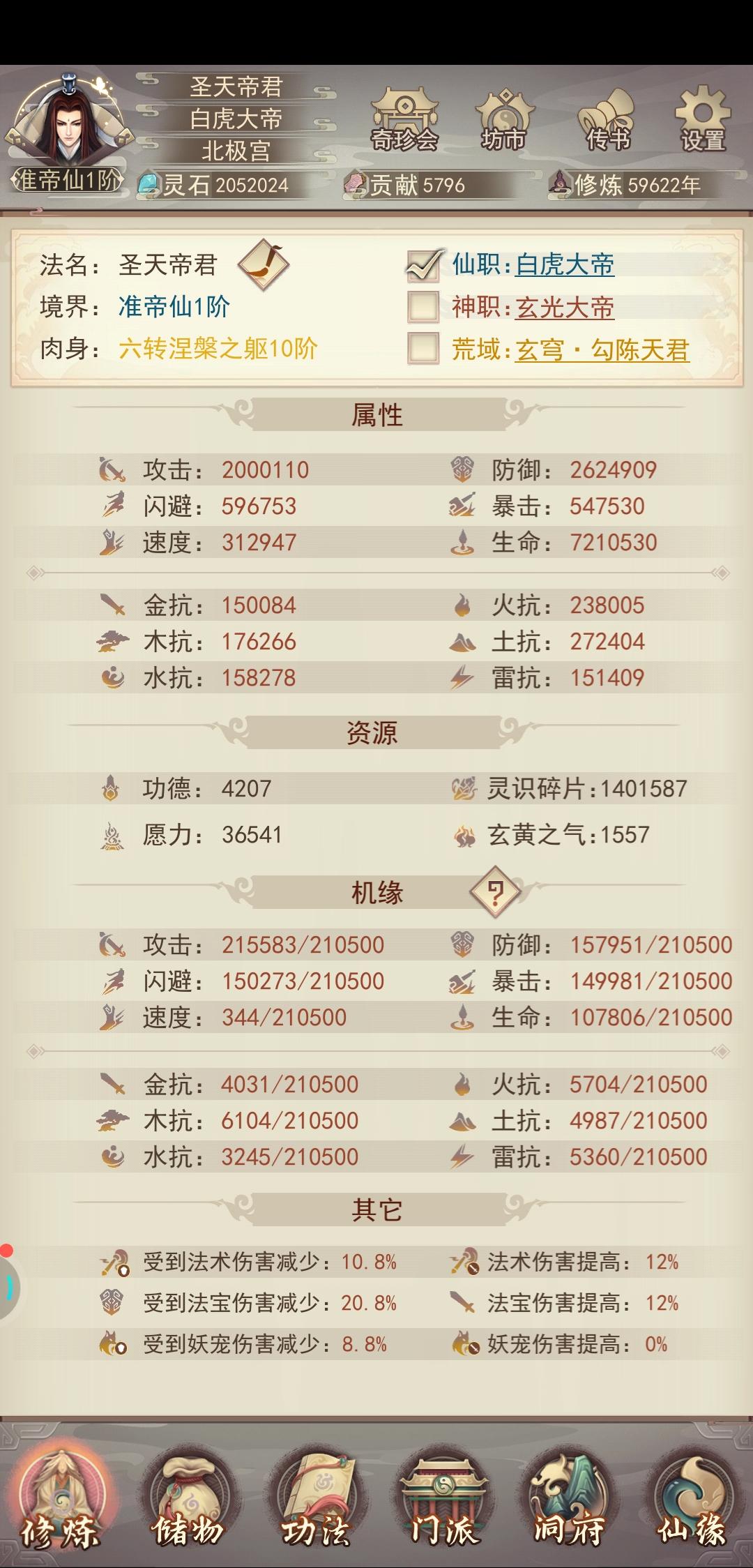 好久没有更新了 玩的号多 这个0氪号每天就上一次线就下了 没有怎么好好玩 宠物也刷不到八星 我从仙君一直刷到现在准帝了 依旧还是这个 不知道是这个号太黑了还是咋滴 攻200万 防262万 血721万 属性应该算是正常的0氪吧 比不上那些大佬玩的 我还是挺满意这个属性的