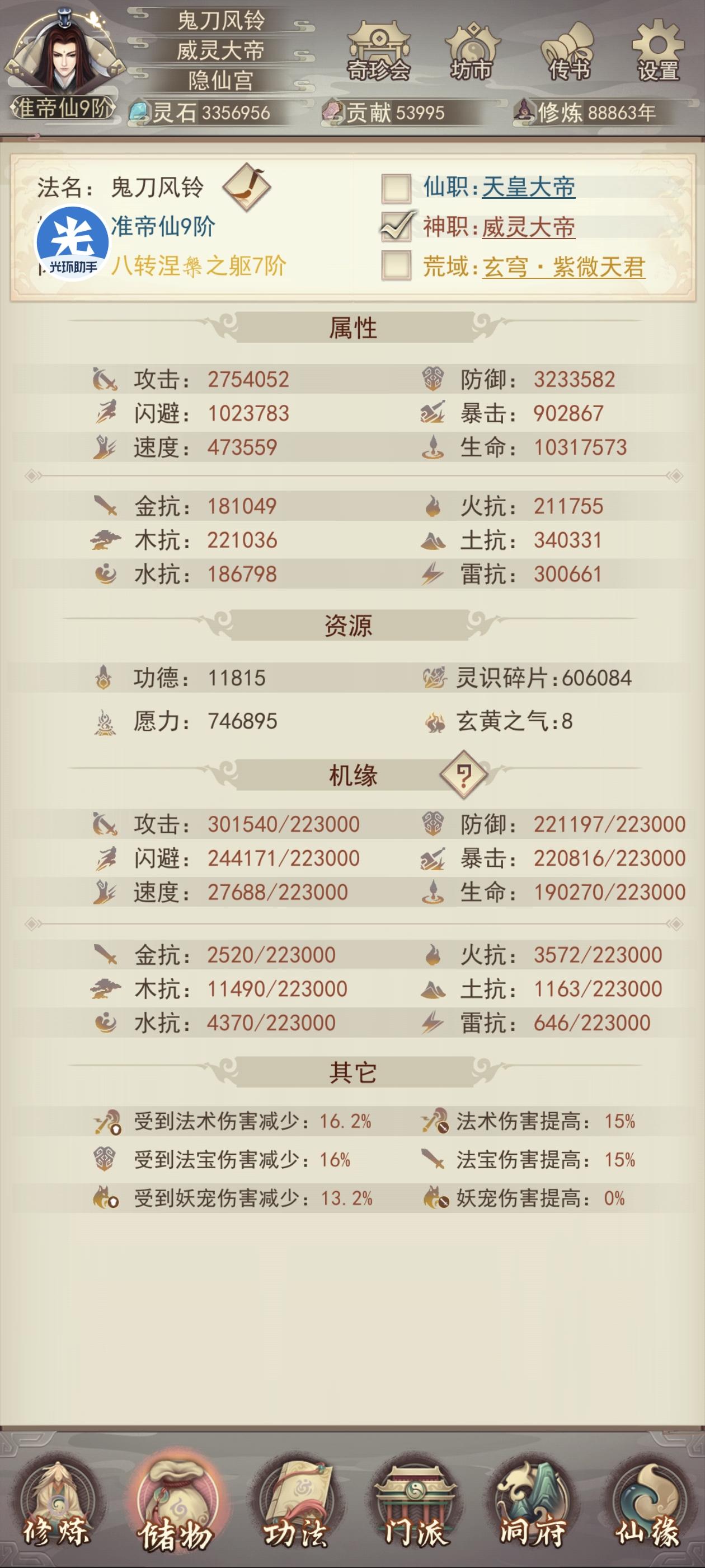 终于万年内成就大罗;遗憾的是金仙9升10劈太多次了,如果少劈一次,也能在9000年前升大罗。感谢133紫曜界大佬们平常的解惑(特别感谢醉酒大帝)和论坛上所有大神发布的详细攻略,让我少走不少弯路。 天命坛是个结,我花了12组多的火髓,才洗出最后一张图的数据,所以需要刷几率的别上头附年份:2年:筑基5年:金丹22年:元婴96年:出窍284年:分神613年:合体1069年:洞虚16