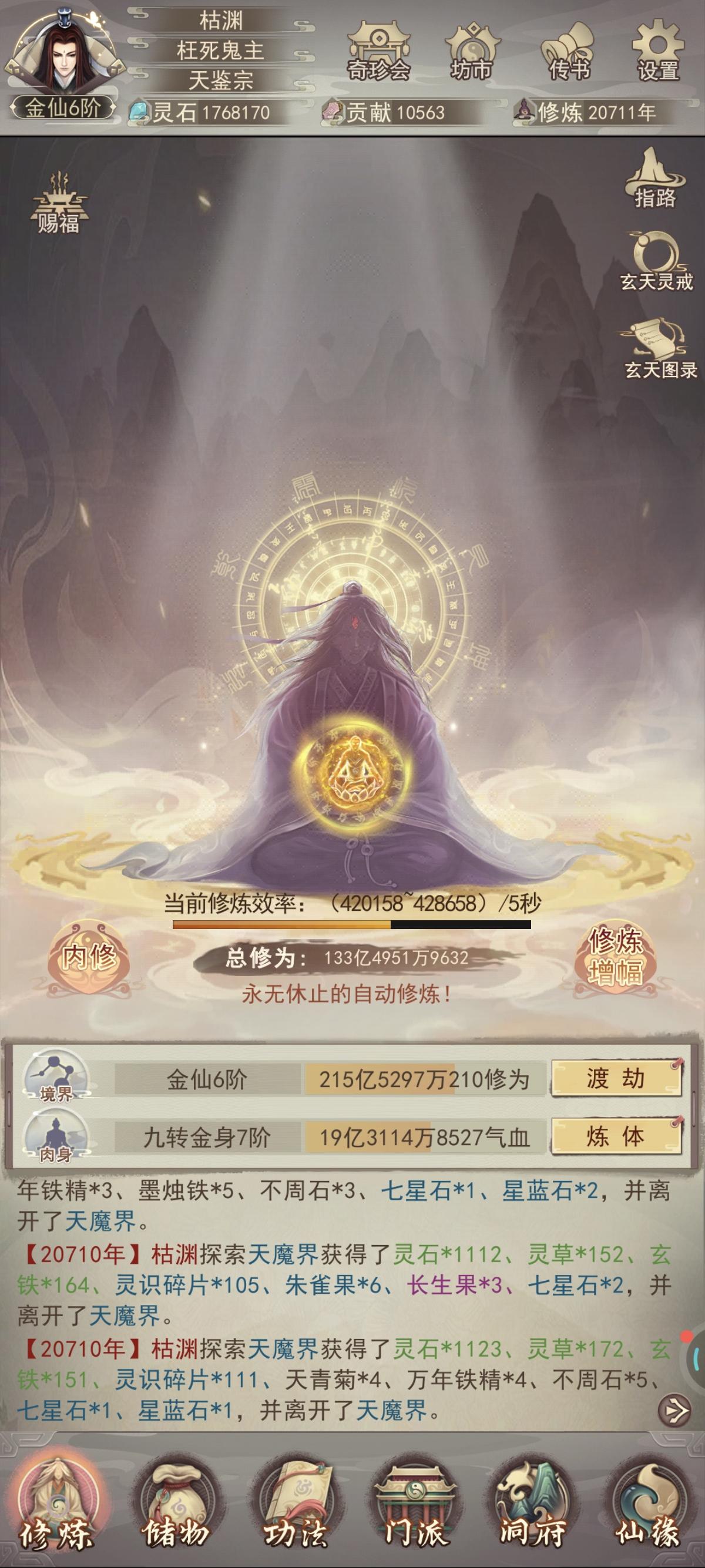 终于万年内成就大罗;遗憾的是金仙9升10劈太多次了,如果少劈一次,也能在9000年前升大罗。感谢133紫曜界大佬们平常的解惑(特别感谢醉酒大帝)和论坛上所有大神发布的详细攻略,让我少走不少弯路。 天命坛是个结,我花了12组多的火髓,才洗出最后一张图的数据,所以需要刷几率的别上头附年份:2年:筑基5年:金丹22年:元婴96年:出窍284年:分神613年:合体1069年:洞虚16