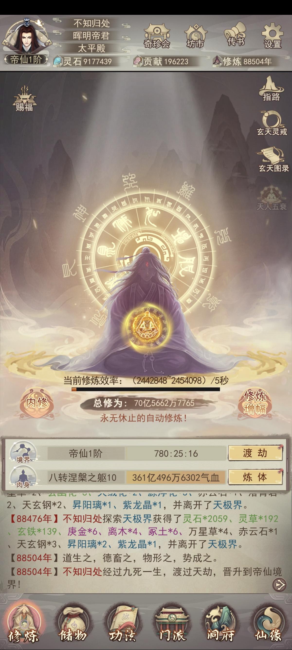1.进入条件天渊入口位于九天十地最下方区域,更新后达到准帝仙境界即可无条件进入,这次终于没有守门员了。进入后即可获得混天鼎以及初始属性,以及鬼佬送的可以开十次炉子炼丹的大道之源。2.混天鼎混天鼎可以炼制元丹,元丹分为三种,分别对应增加攻击,防御,血量。元丹炼制需要大道之源,大道之源通过探索天渊(走格子)以及占领上古道境获取3.混天珠天渊宝库中可以获取混天珠,探索天渊获得天渊晶兑换最多五颗