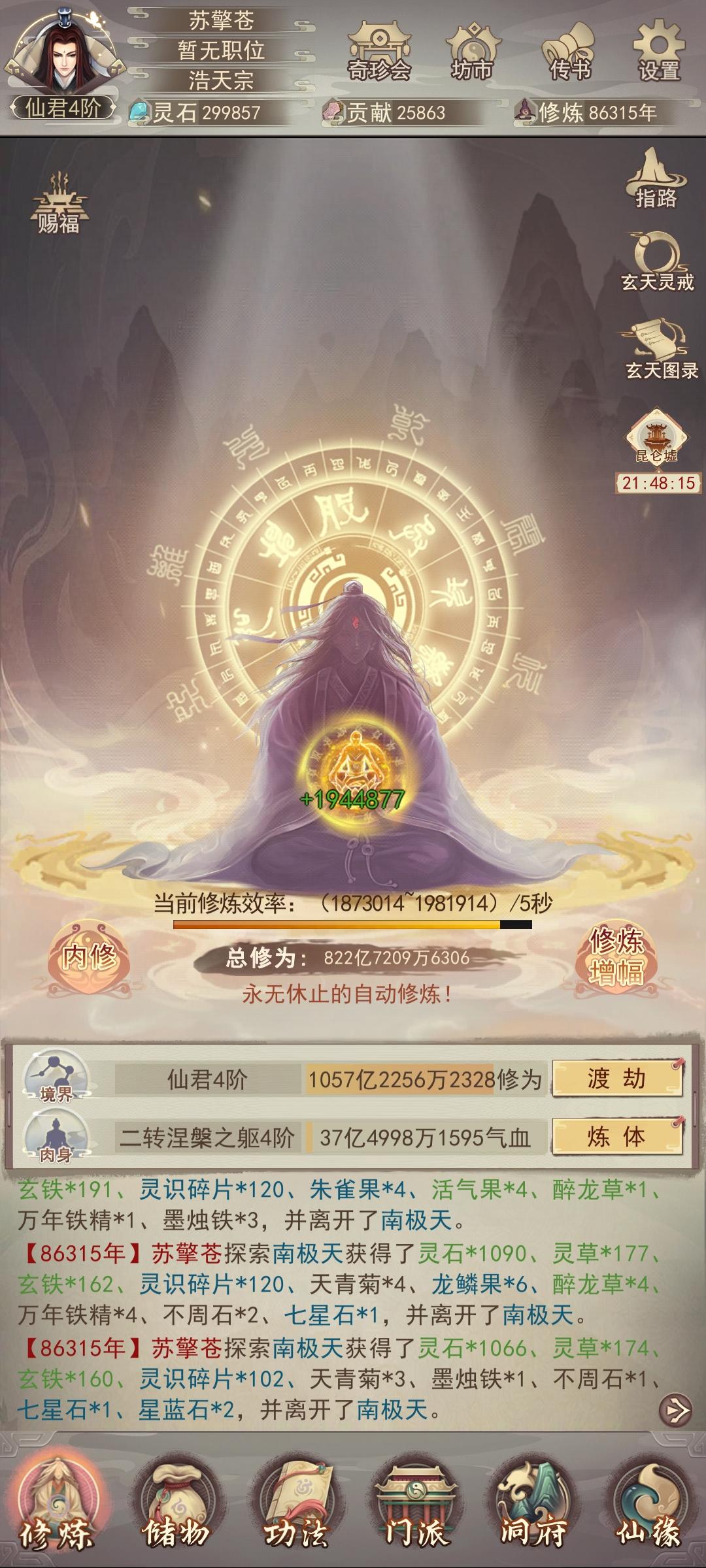 第1年:踏入练气期(悟道聚气,开启自动修炼)第33年:踏入筑基期第39年:跨入凡人之躯第76年:踏入金丹期第108年:踏入元婴期第121年:跨入钢筋铁骨第181年:跨入力抵百牛第209年:踏入出窍期第268年:跨入铜骨之躯第480年:跨入银骨之躯第499年:踏入分神期底602年,极品裤子离我而去!百分之99=0,大家一定要吸取教训!!#凡人传说 五百余年间步步为营,历经天劫