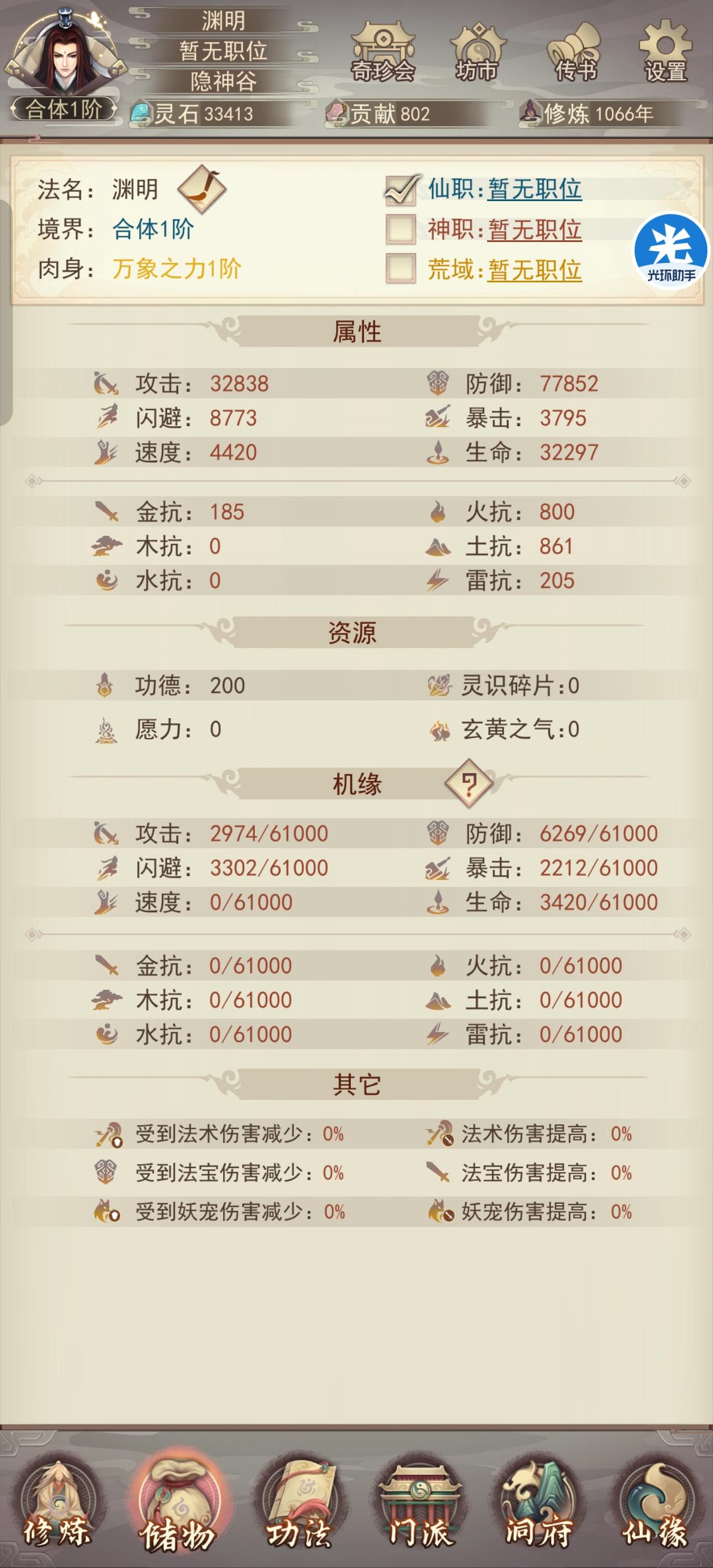 终于万年内成就大罗;遗憾的是金仙9升10劈太多次了,如果少劈一次,也能在9000年前升大罗。感谢133紫曜界大佬们平常的解惑(特别感谢醉酒大帝)和论坛上所有大神发布的详细攻略,让我少走不少弯路。 天命坛是个结,我花了12组多的火髓,才洗出最后一张图的数据,所以需要刷几率的别上头附年份:2年:筑基5年:金丹22年:元婴96年:出窍284年:分神613年:合体1069年:洞虚16