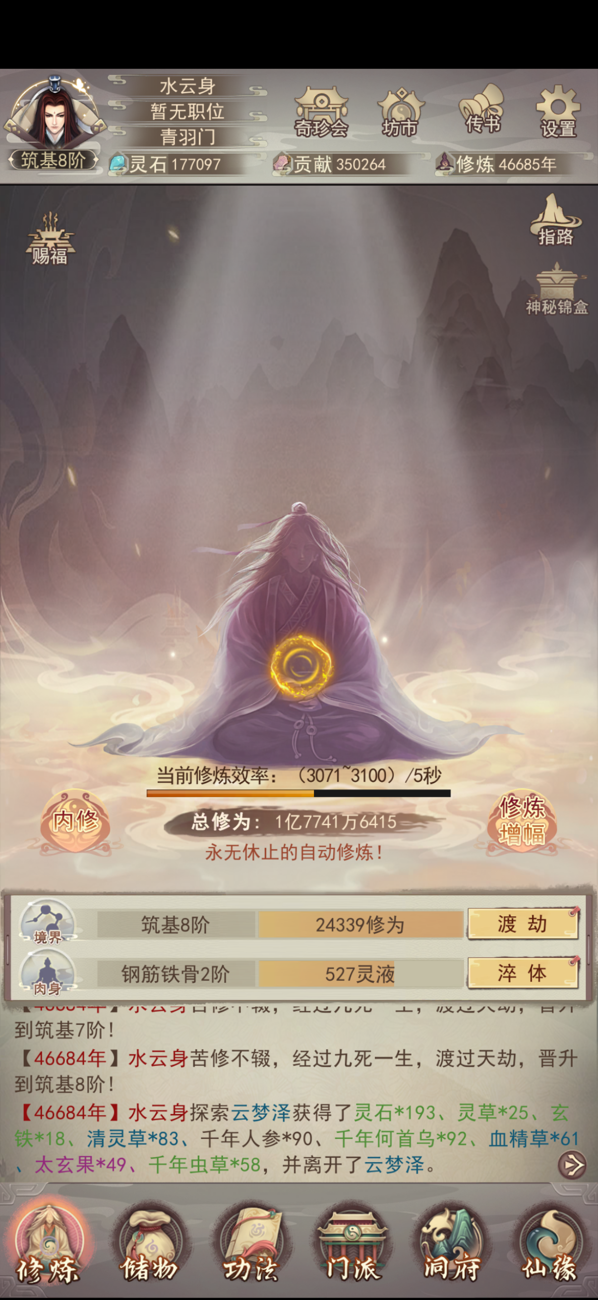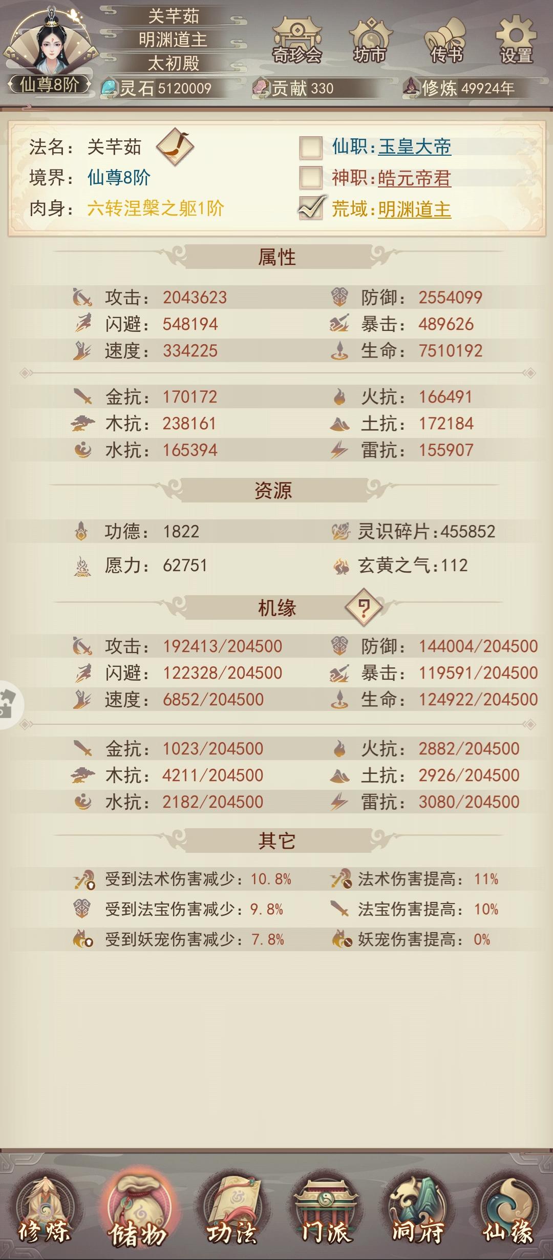 浑浑噩噩两万载,走了不少弯路,多亏了群里各位大佬帮忙也不算太差,唯一的遗憾就是终究没能突破大罗。仙宗的法术是真恶心啊,刚上天没多久就差两本,快大罗了还差两本。