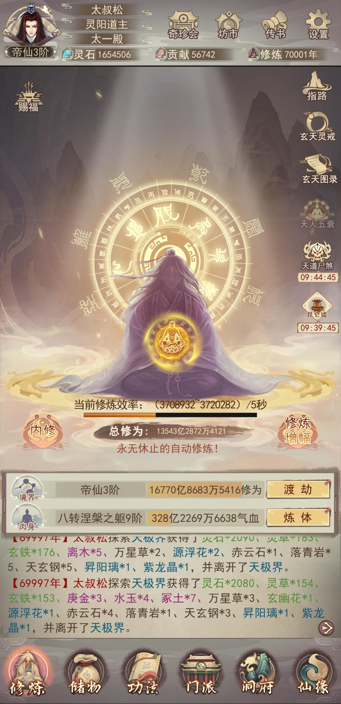 1.进入条件天渊入口位于九天十地最下方区域,更新后达到准帝仙境界即可无条件进入,这次终于没有守门员了。进入后即可获得混天鼎以及初始属性,以及鬼佬送的可以开十次炉子炼丹的大道之源。2.混天鼎混天鼎可以炼制元丹,元丹分为三种,分别对应增加攻击,防御,血量。元丹炼制需要大道之源,大道之源通过探索天渊(走格子)以及占领上古道境获取3.混天珠天渊宝库中可以获取混天珠,探索天渊获得天渊晶兑换最多五颗