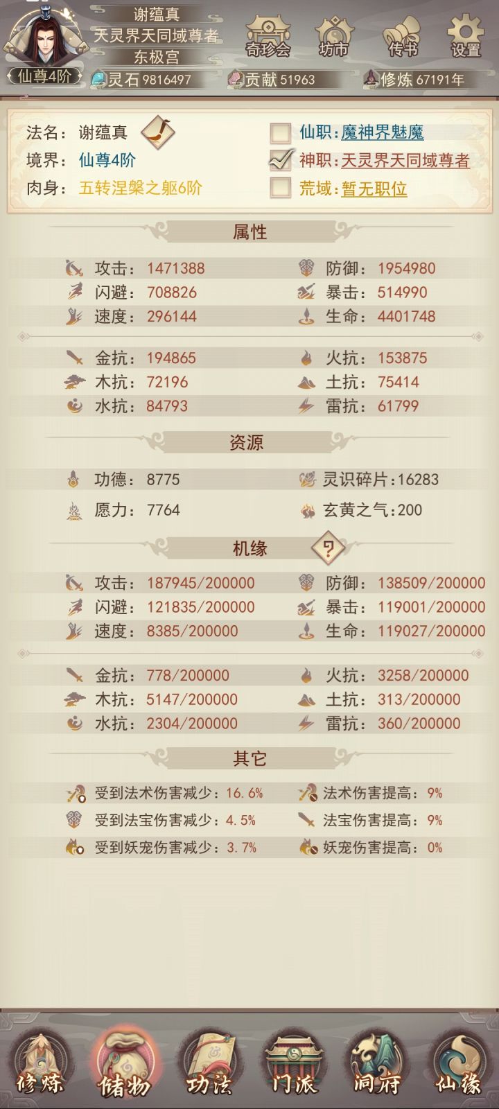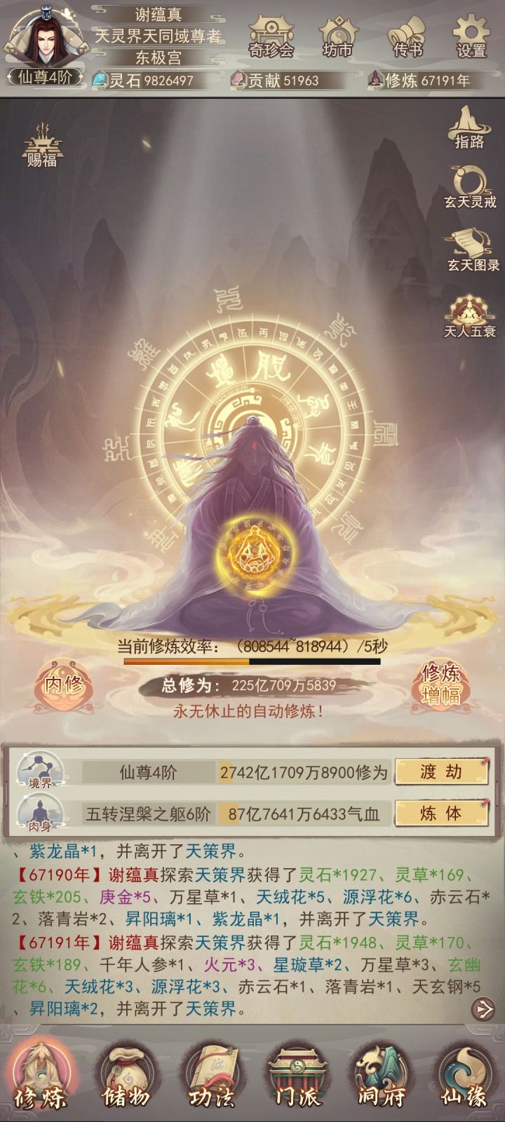 终于万年内成就大罗;遗憾的是金仙9升10劈太多次了,如果少劈一次,也能在9000年前升大罗。感谢133紫曜界大佬们平常的解惑(特别感谢醉酒大帝)和论坛上所有大神发布的详细攻略,让我少走不少弯路。 天命坛是个结,我花了12组多的火髓,才洗出最后一张图的数据,所以需要刷几率的别上头附年份:2年:筑基5年:金丹22年:元婴96年:出窍284年:分神613年:合体1069年:洞虚16