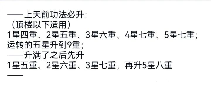 1、修速高于一切,在基本过图的情况请尽量拉修速,境界上去了才能吃饼。(能强度就强度不要像我满度)2、仙门的阵法请学全(我就没学全,前天才知道这个弯路)五行聚灵不是让你转换零食的,是要你运转的阵法加属性的。3、装备请先在凡人 2 刷出金防,后面可以不管锁防御刷紫色攻击用着就行,戒指也是金防就不管了。所有装备在仙 7 开 5 词条开始洗炼,攻防+三抗,戒指也是。装备升级顺序头、衣、裤三个平均优先级