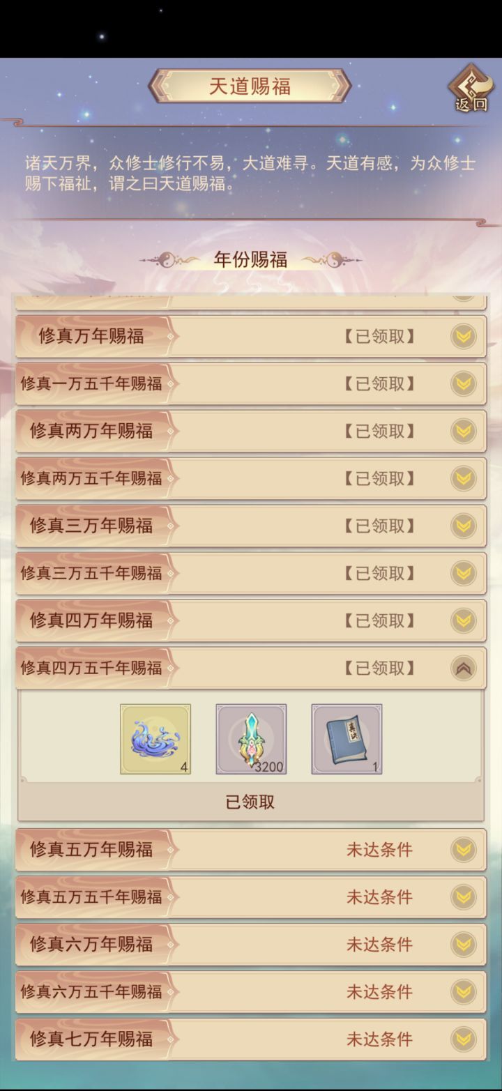 元年:感应天地灵气,成功引气入体,正式踏入练气期,并觉醒了自动修炼之能。三十三年:道基凝结,生命层次蜕变,踏入筑基期。三十九年:身躯经灵气反复冲刷,终跨入凡人之躯的极限。七十六年:丹田内金丹初成,光华内蕴,就此踏入金丹期。一百零八年:破丹成婴,神念初生,踏入元婴期。一百二十一年:肉身再度突破,跨入钢筋铁骨之境。一百八十一年:气力磅礴增长,跨入力抵百牛之境。二百零九年:元神可离体神游,