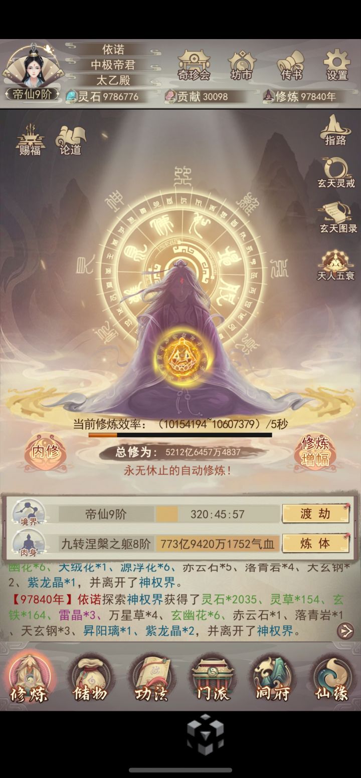 终于万年内成就大罗;遗憾的是金仙9升10劈太多次了,如果少劈一次,也能在9000年前升大罗。感谢133紫曜界大佬们平常的解惑(特别感谢醉酒大帝)和论坛上所有大神发布的详细攻略,让我少走不少弯路。 天命坛是个结,我花了12组多的火髓,才洗出最后一张图的数据,所以需要刷几率的别上头附年份:2年:筑基5年:金丹22年:元婴96年:出窍284年:分神613年:合体1069年:洞虚16