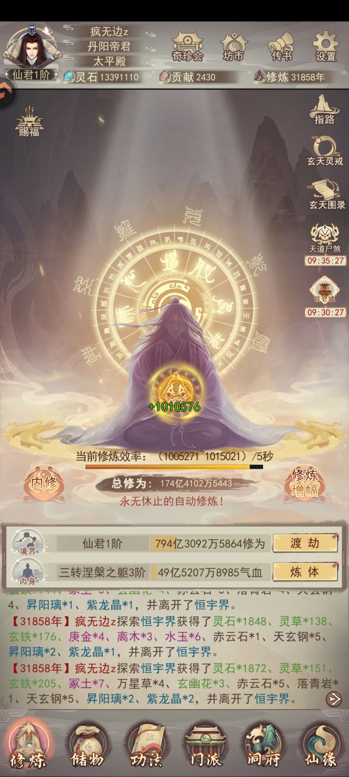 终于万年内成就大罗;遗憾的是金仙9升10劈太多次了,如果少劈一次,也能在9000年前升大罗。感谢133紫曜界大佬们平常的解惑(特别感谢醉酒大帝)和论坛上所有大神发布的详细攻略,让我少走不少弯路。 天命坛是个结,我花了12组多的火髓,才洗出最后一张图的数据,所以需要刷几率的别上头附年份:2年:筑基5年:金丹22年:元婴96年:出窍284年:分神613年:合体1069年:洞虚16