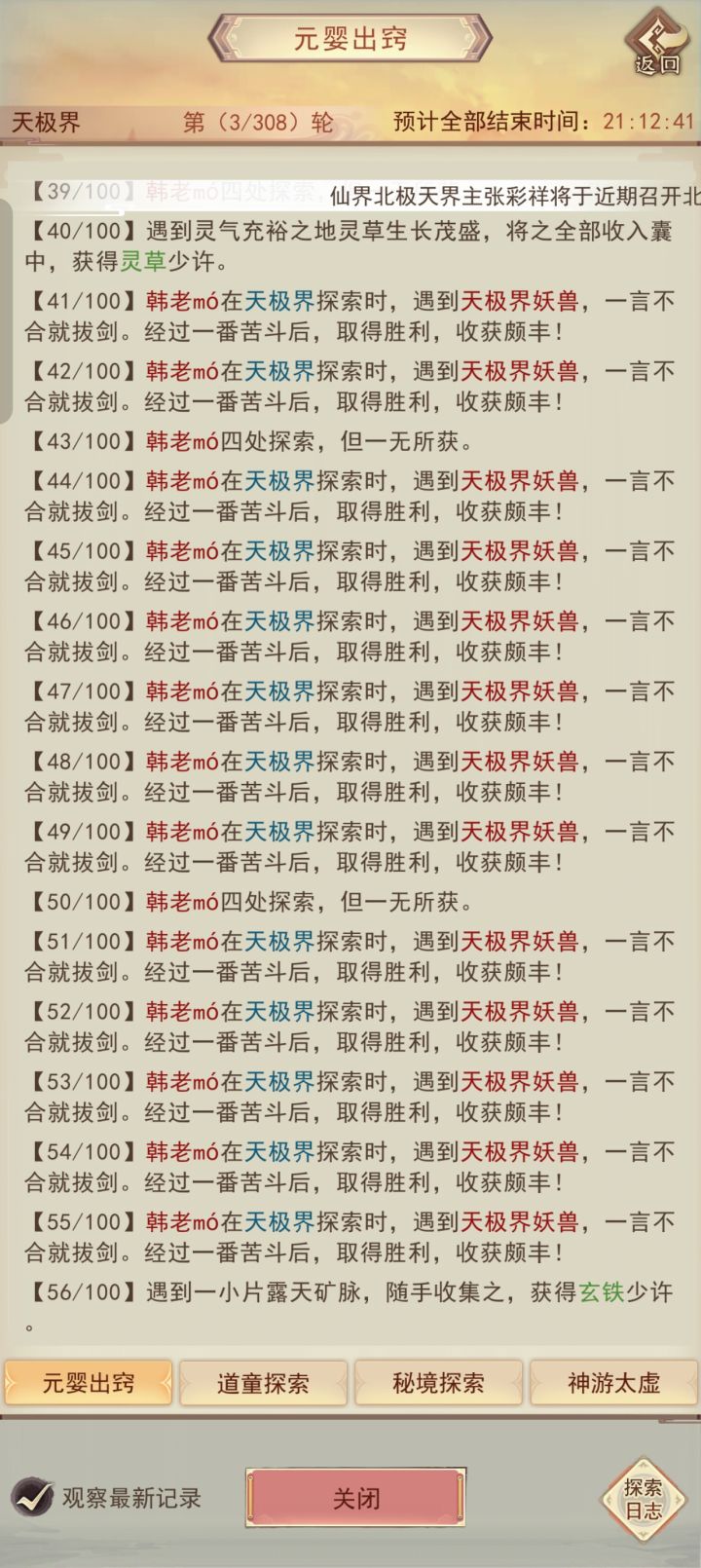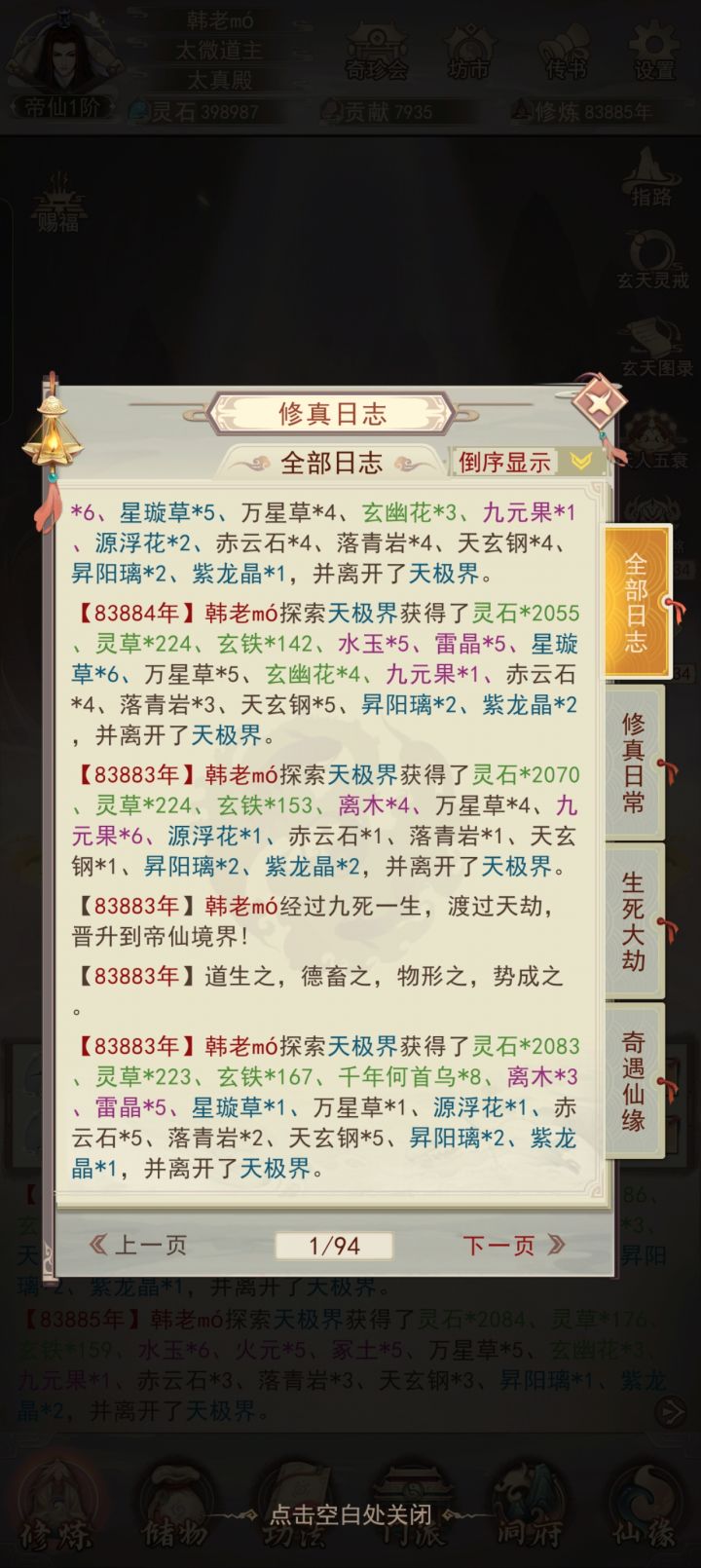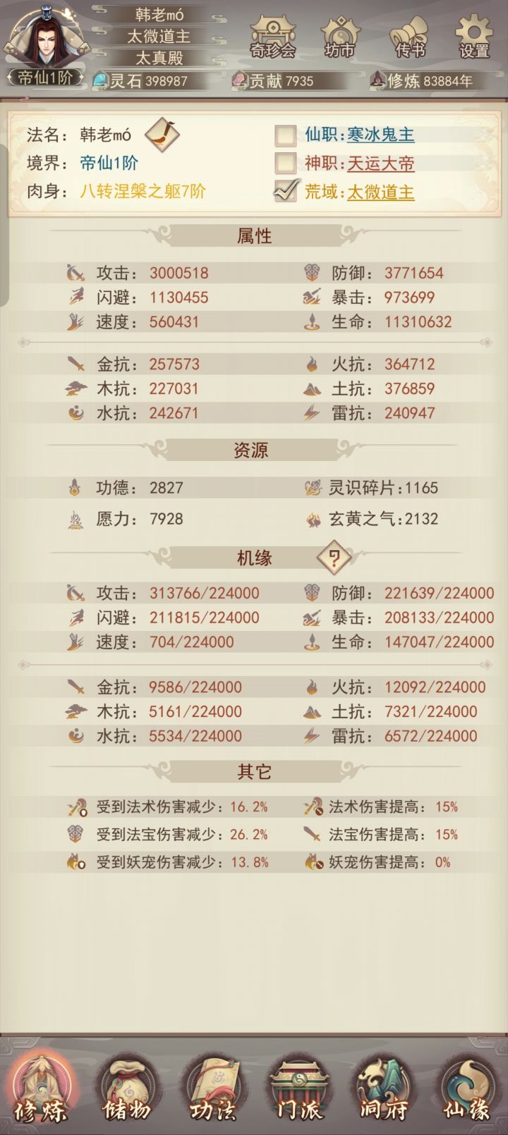 修真无岁月,转眼又万年。不知不觉中修真已有83883年了,练习时长也有两年半了。作为一个零氪,能坚持到现在除了群友的陪伴之外,就是想看看自己能否熬到帝仙,届时属性又如何?没想到最终竟实现了。在此记录一下自己的修仙历程。0年,练气4年,筑基11年,金丹73年,元婴350年,出窍819年,分神1271年,合体2102年,洞虚3218年,大乘4470年,洞真6001年,散仙8