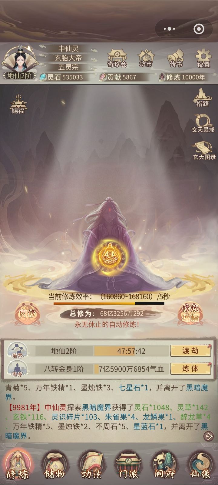 修真无岁月,转眼又万年。不知不觉中修真已有83883年了,练习时长也有两年半了。作为一个零氪,能坚持到现在除了群友的陪伴之外,就是想看看自己能否熬到帝仙,届时属性又如何?没想到最终竟实现了。在此记录一下自己的修仙历程。0年,练气4年,筑基11年,金丹73年,元婴350年,出窍819年,分神1271年,合体2102年,洞虚3218年,大乘4470年,洞真6001年,散仙8