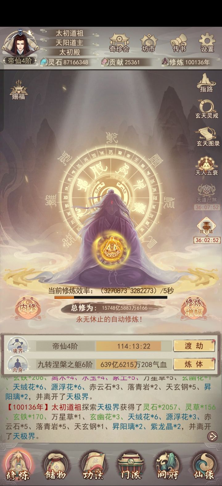 修真无岁月,转眼又万年。不知不觉中修真已有83883年了,练习时长也有两年半了。作为一个零氪,能坚持到现在除了群友的陪伴之外,就是想看看自己能否熬到帝仙,届时属性又如何?没想到最终竟实现了。在此记录一下自己的修仙历程。0年,练气4年,筑基11年,金丹73年,元婴350年,出窍819年,分神1271年,合体2102年,洞虚3218年,大乘4470年,洞真6001年,散仙8