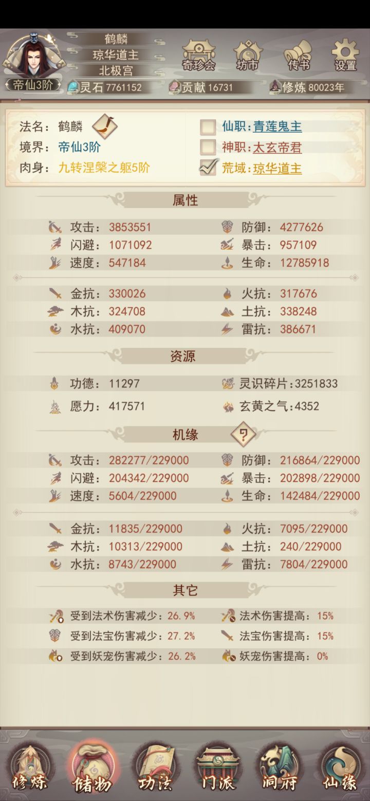 修真无岁月,转眼又万年。不知不觉中修真已有83883年了,练习时长也有两年半了。作为一个零氪,能坚持到现在除了群友的陪伴之外,就是想看看自己能否熬到帝仙,届时属性又如何?没想到最终竟实现了。在此记录一下自己的修仙历程。0年,练气4年,筑基11年,金丹73年,元婴350年,出窍819年,分神1271年,合体2102年,洞虚3218年,大乘4470年,洞真6001年,散仙8