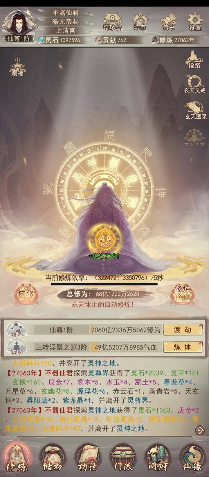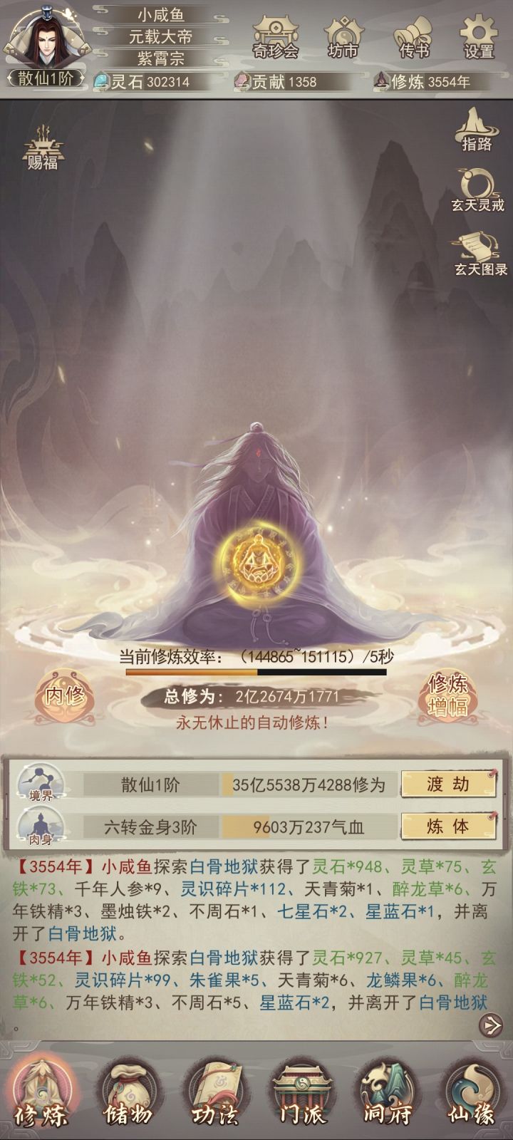 修真无岁月,转眼又万年。不知不觉中修真已有83883年了,练习时长也有两年半了。作为一个零氪,能坚持到现在除了群友的陪伴之外,就是想看看自己能否熬到帝仙,届时属性又如何?没想到最终竟实现了。在此记录一下自己的修仙历程。0年,练气4年,筑基11年,金丹73年,元婴350年,出窍819年,分神1271年,合体2102年,洞虚3218年,大乘4470年,洞真6001年,散仙8