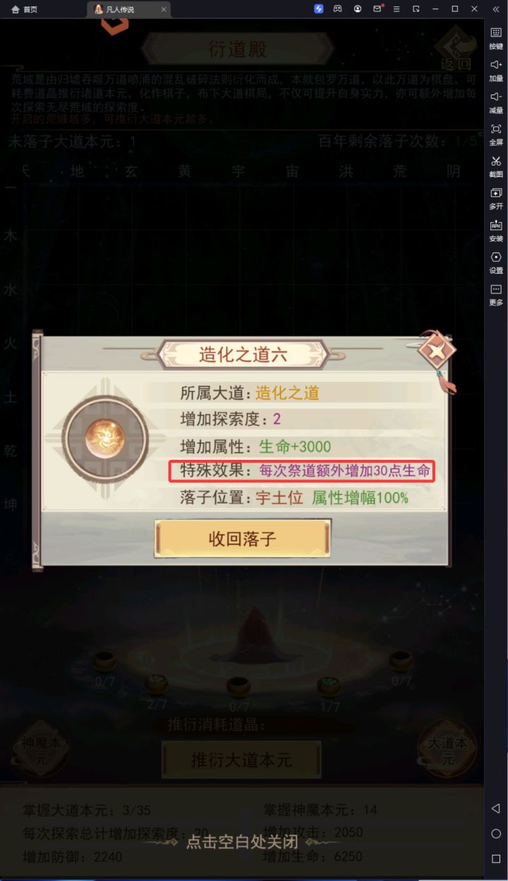最新发现,棋子放置在指定棋格上时,会触发独特的额外效果。例如:造化6 放在 宇土 位置时,不仅会享受100%加成,还会额外获得 大道祭台的祭道效果,并有特殊图标然而,通过进一步测试发现:除了造化6,其余造化棋子放在同样位置并没有触发额外效果;甚至连普通的 100% 加成都无法稳定获得。推测每个棋子可能都存在一个独一无二 “完美专属棋位”,放对位置才能解锁隐藏效果。如果有道友测试出了某