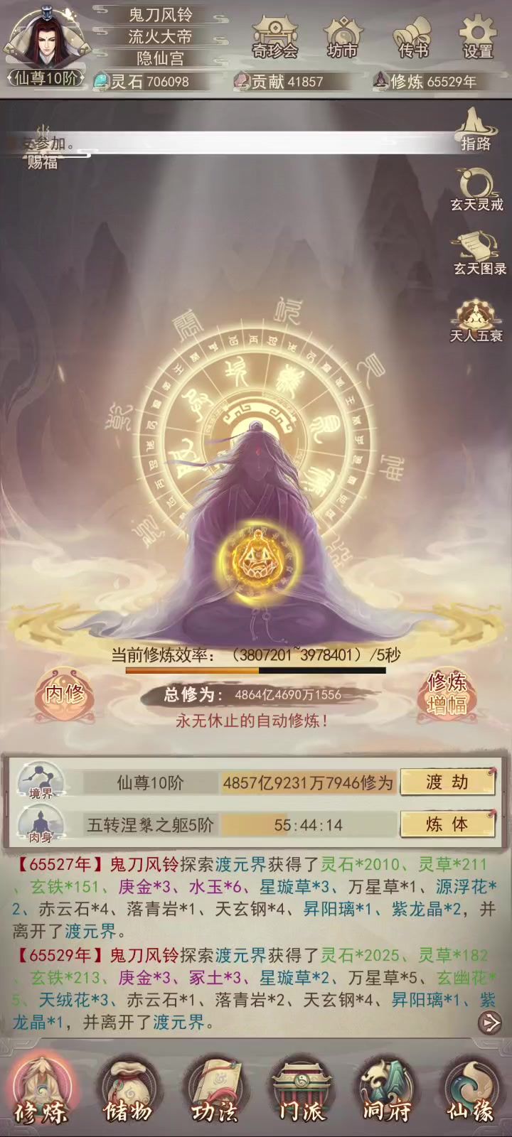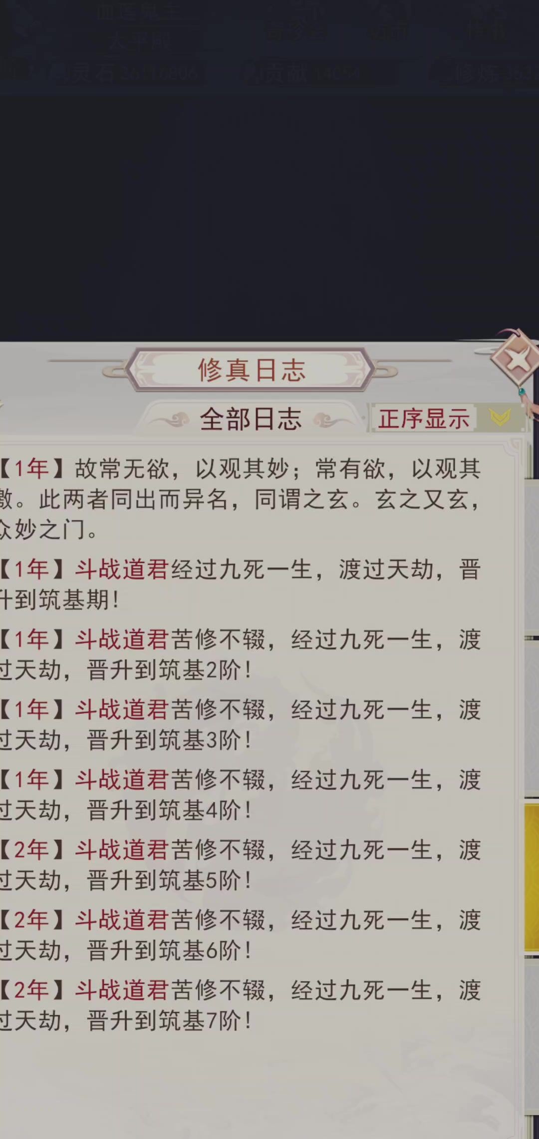证道仙君颂 初岁筑基凝气先,三秋金丹映丹田。 廿霜元婴脱尘茧,百朝出窍上云巅。 三百余载神分影,七百经霜体合玄。 千五洞虚窥天道,两千大乘道基全。 三千八秩真如现,五千散仙始列班。 八千再越仙阶境,万一千三地仙筵。 万四天仙承天眷,万六金仙掌法权。 万九大罗臻妙境,三万玄仙步紫烟。 今至三五二七劫,终证仙君傲九天。#凡人传说