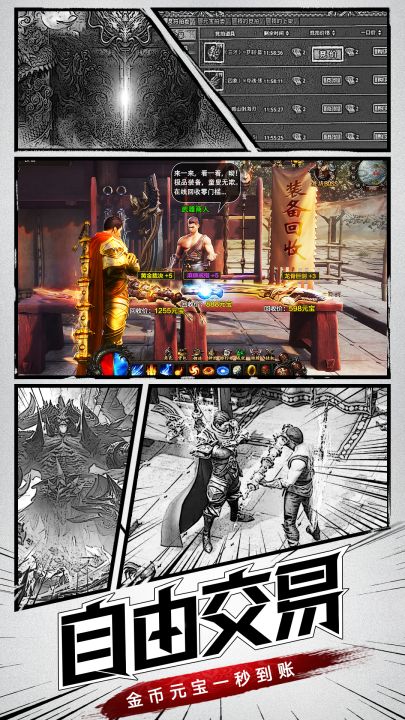 开局满攻速,直击天灵盖的快感!游戏升级玩法无比轻松!在玩法设计上,以“升级、爆装、pk、攻沙”四大传奇经典玩法为核心,同时增加BOSS红包、王者殿堂、武道巅峰等多种精彩玩法等你来体验!斩万敌,踏苍穹,威临诸天万界!