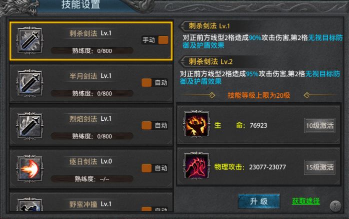 规则说明 1、战士拥有刺杀剑法、半月剑法、烈焰剑法、逐日剑法、野蛮冲撞、无情怒冲、龙爪手、护体罡气、魔法盾、星陨火雨、十步一杀、施毒术、火龙召唤技能。 2、提升技能可提高技能的属性值 3、学习技能后使用对应的技能书可以增加技能熟练度#攻略