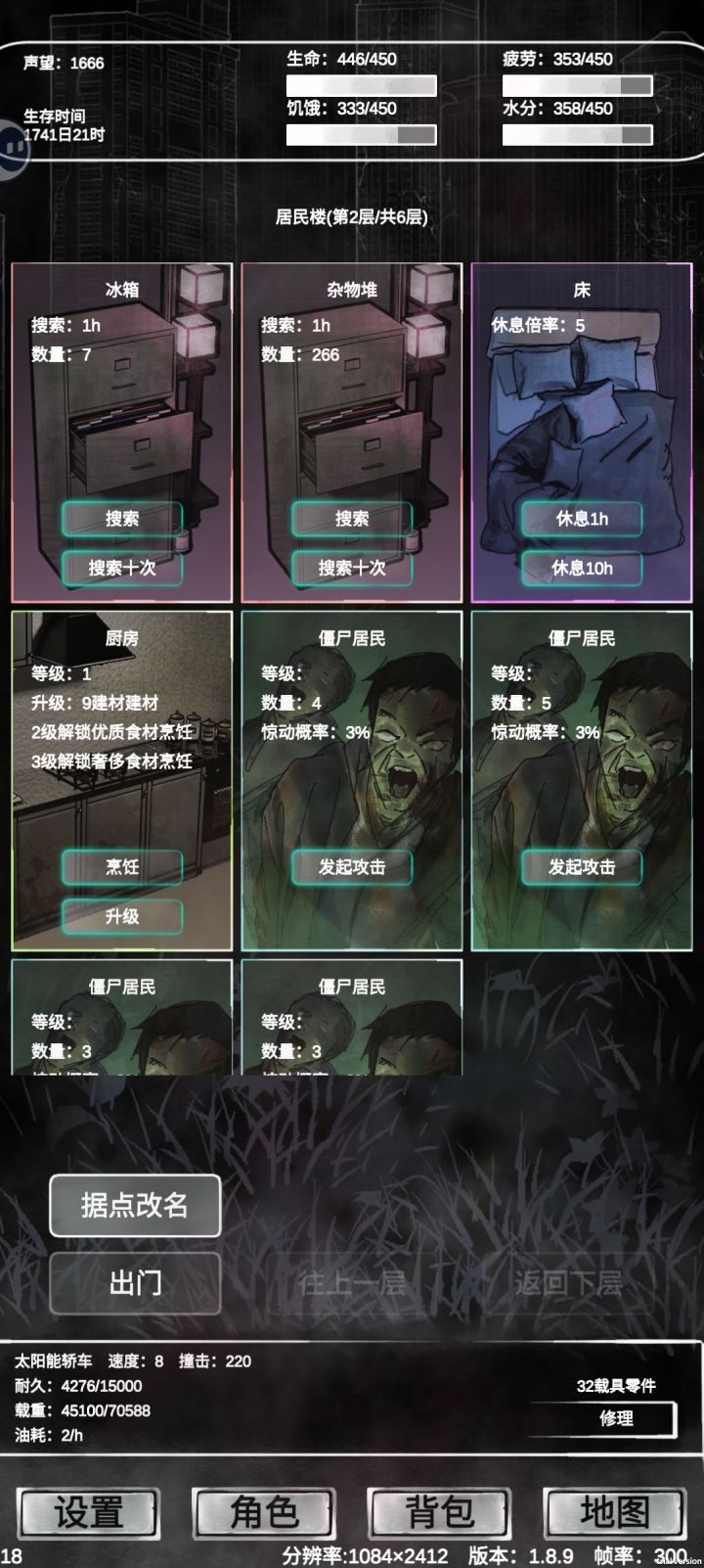 卡住了,可以吃东西,搜索掉饱食度但不给东西,丧尸打完回不去了,重启回到没打丧尸前,再打也一样卡着没反应,可以出门,出门后点其他房间没反应