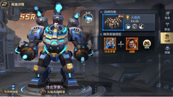 作为游戏内的主角-英雄,英雄搭配的组合推荐自然少不了,合理的英雄搭配,能让自己阵容的战力更上一层楼,接下来小编带指挥官走进英雄搭配环节~ 英雄介绍每个兵种有不同的指挥官(即是英雄)选择,合理的英雄搭配,能大幅度增加自己的战力,在PVP、PVE环境中更能如虎添翼~ (测试服截图仅供参考,最终请以游戏内实际为准) 如图,兵种-火焰兵,系统推荐的英雄搭配是冷炎学家+战鼓。为什么是这么搭配呢?其细节