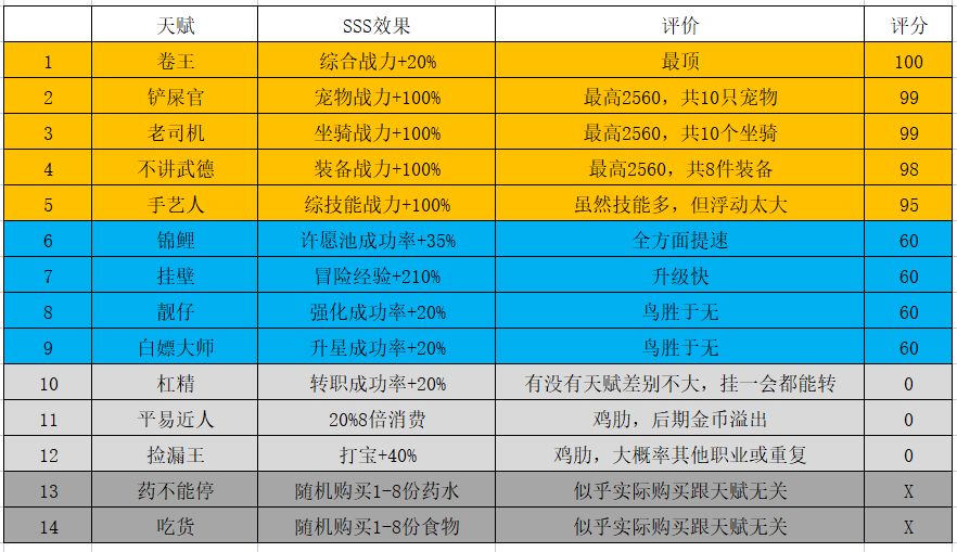 先说这个游戏的主要目的就是堆战力,所以天赋也尽量选增加战力的,总共有五个加战力的天赋:卷王,铲屎官,不讲武德,手艺人,老司机,其中卷王>铲屎官=老司机>手艺人>不讲武德,除了卷王,铲屎官和老司机所加的最高战力是25600,手艺人和不讲武德可以加的最高战力是22480和20480战力,剩下的两个关键天赋是药不能停和吃货,药剂店和酒馆每个小时最高可以分别产出增加77280战力的道具(需要在线),但是没