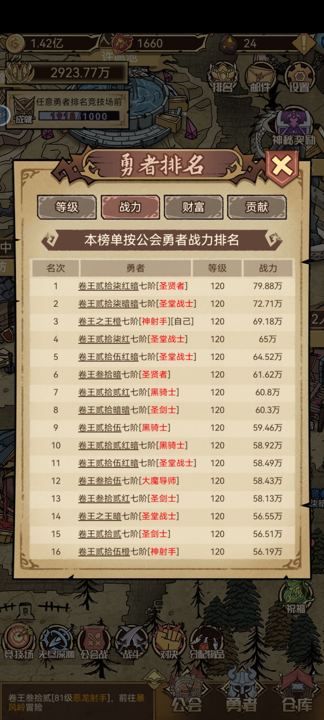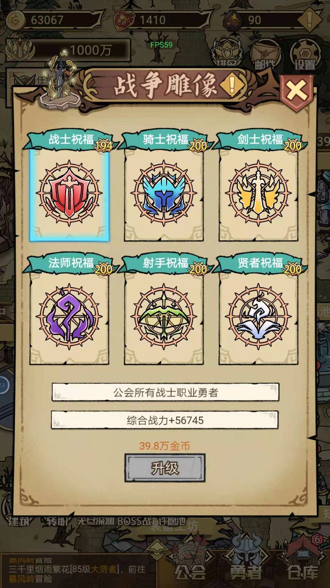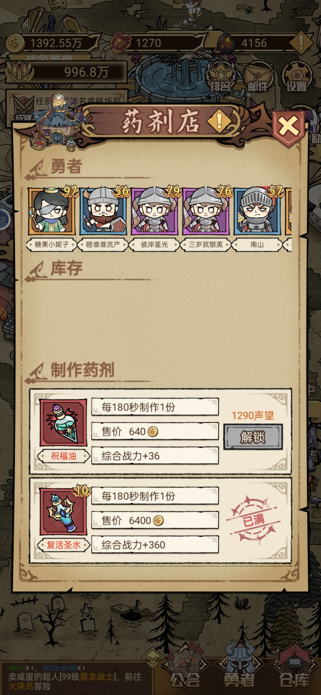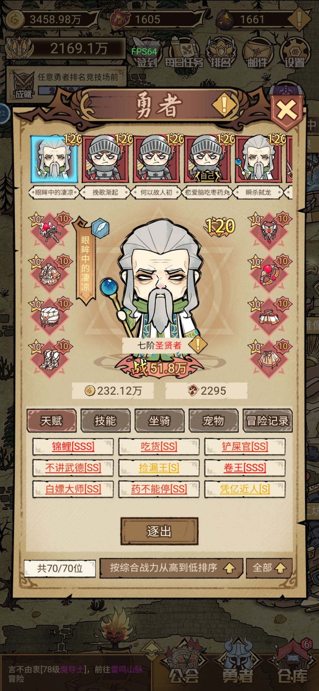 先发个毕业图 游戏说白了就是挂机涨属性,唯一有技术含量的就是刷天赋,除了战斗力天赋其他的基本没用,都可以通过进击肝出来,SSS级公会要3000万战力才能升,70人,平均战力要43万,战力的五个天赋尽量拉满,强烈推荐天赋卷王刷到SSS,我刷到最高战力图 吃货,药不能停这两个天赋一言难尽,一般逛药剂店和酒馆会买最贵的几种药,最贵的产量又堪忧,占着坑位,低级药严重压箱,这就导致这两个技能十分鸡肋。 前期