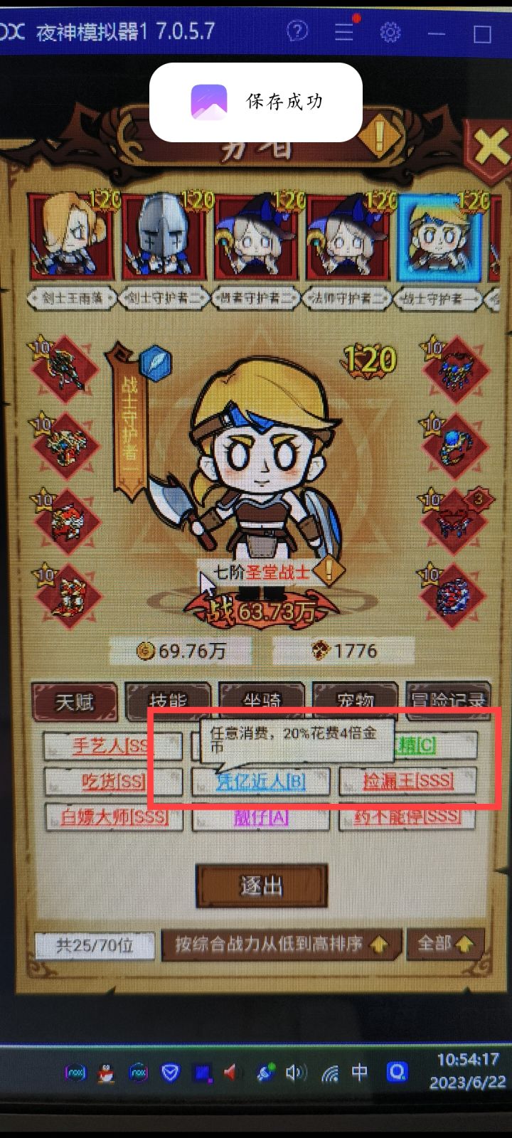 先发个毕业图游戏说白了就是挂机涨属性,唯一有技术含量的就是刷天赋,除了战斗力天赋其他的基本没用,都可以通过进击肝出来,SSS级公会要3000万战力才能升,70人,平均战力要43万,战力的五个天赋尽量拉满,强烈推荐天赋卷王刷到SSS,我刷到最高战力图吃货,药不能停这两个天赋一言难尽,一般逛药剂店和酒馆会买最贵的几种药,最贵的产量又堪忧,占着坑位,低级药严重压箱,这就导致这两个技能十分鸡肋。前期