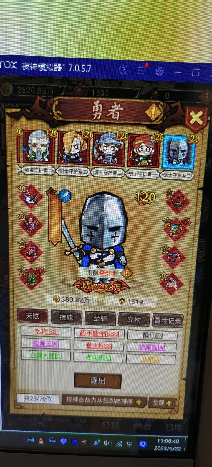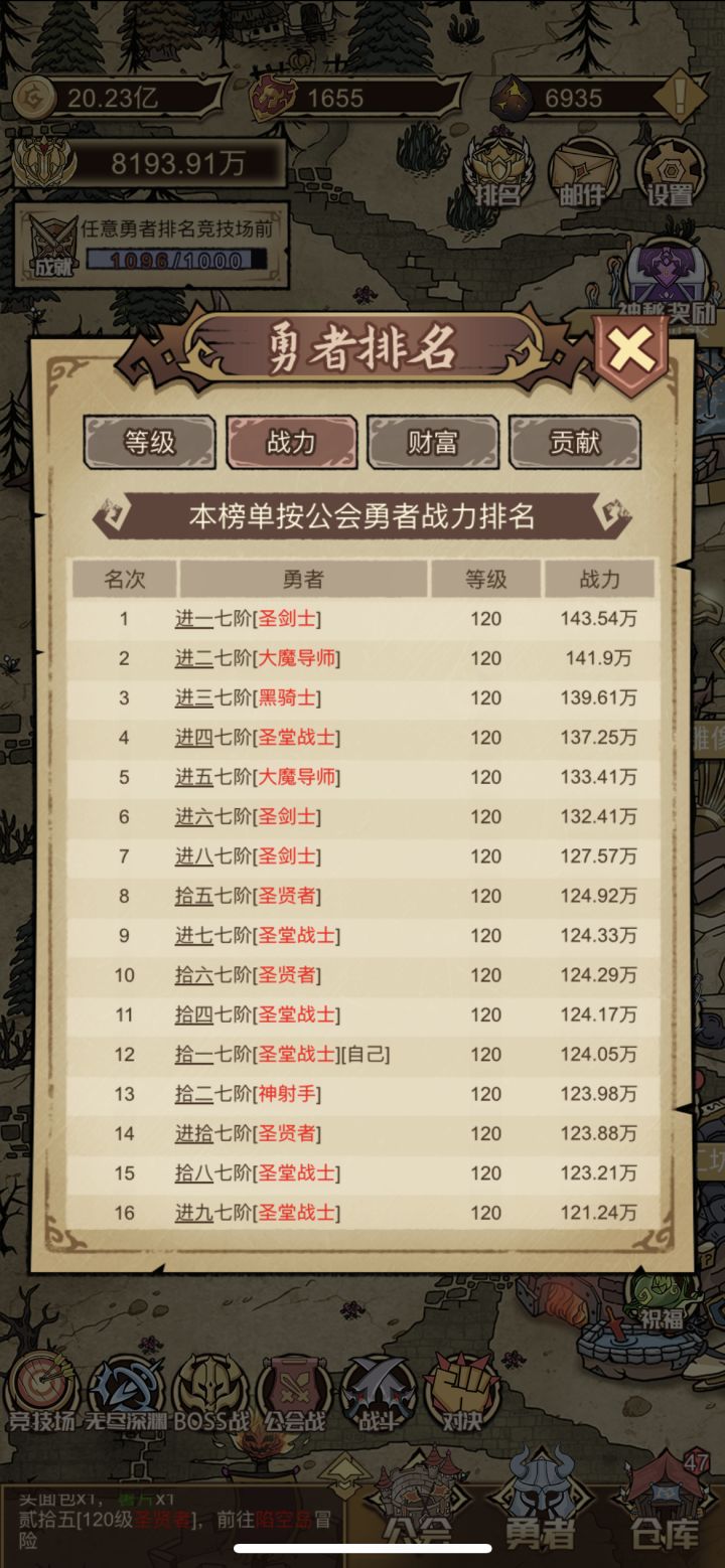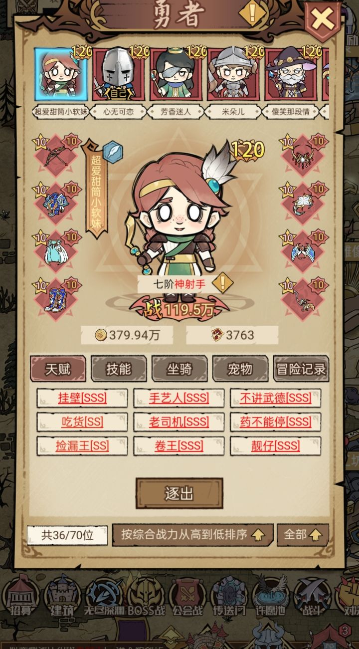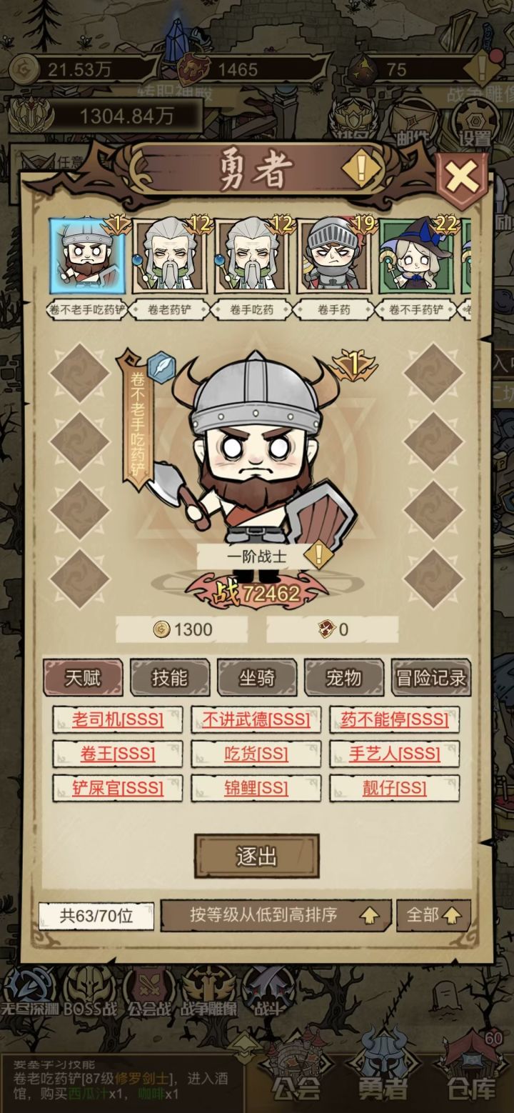 卷王SSS是基础,吃喝SS足以支持日常所需,刷五战浪费时间的同时……很鸡肋。重点:不要有任何的“凭亿近人”,哪怕是黑色的D也要果断丢弃,但只要卷吃喝合格,其他全是D都是完美卡。人数20以内,25人会出现红色供不应求,各种有工具人去做,比如深渊单人打箱子、工会战五工具人凑数,工具人强化升星等等。这是挂机游戏,是卷死别人吃吃喝喝的游戏,睡觉前招一些带着凭亿近人的工具人,去刷成就,第二天打完boss