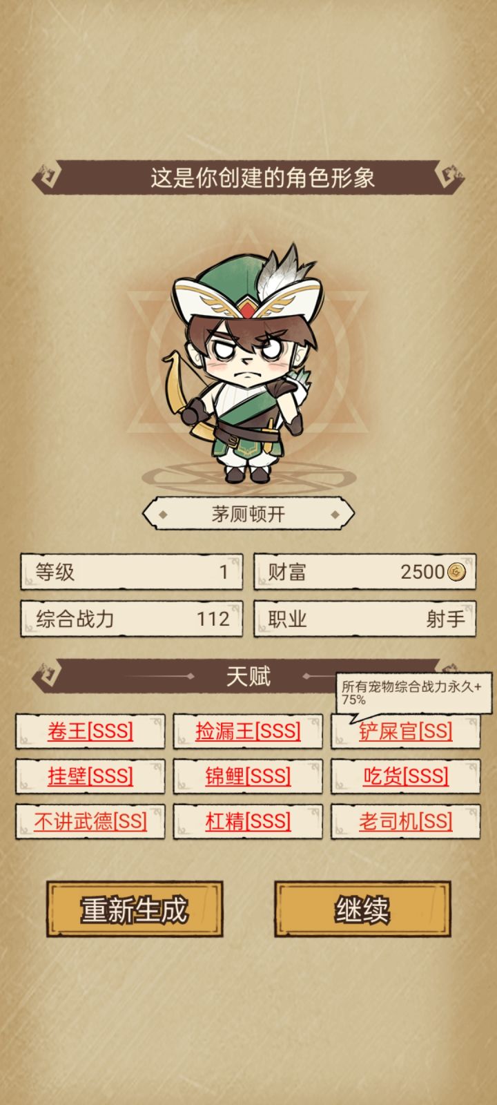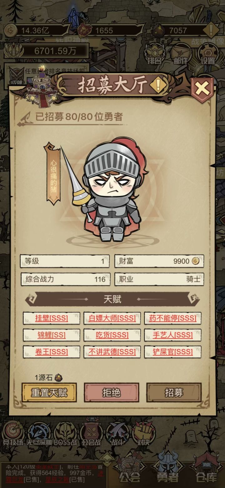 开局:开局主角是需要刷一下,不需要全红,全sss的。因为本就是挂机游戏,哪怕全是最垃圾的D级天赋词条,长时间挂机,也能登顶竞技场第一!初始就看有没有[卷王sss],[综合战力118],(不一定就是118,110以上就算好苗子)这俩个才是核心中的核心!有这两个就是完美开局![重点:有3s卷王的情况下,综合战力是110+的]!!这俩个是基础!其他无所谓,先开局,后面慢慢刷主角的天赋!不必在开局