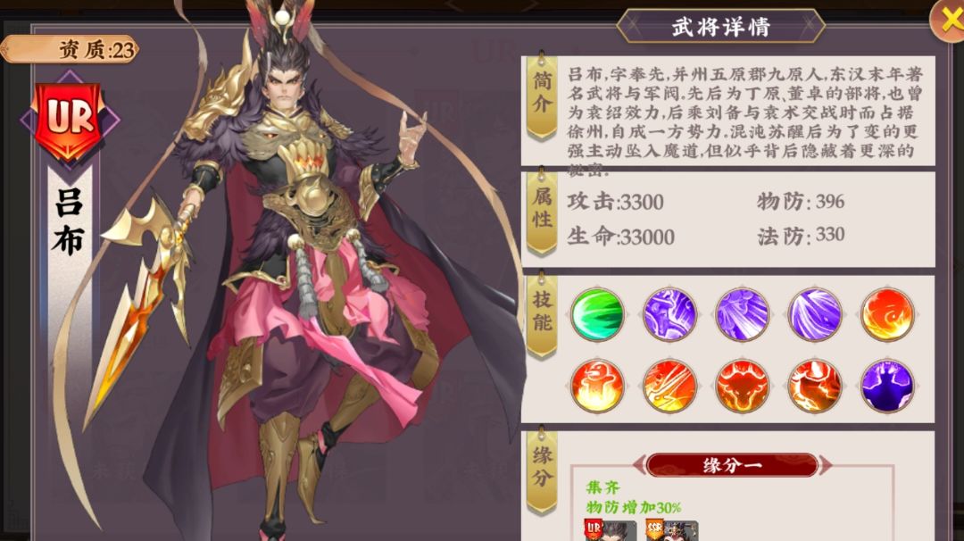 吕布,品级UR,资质23 获取方法:限时神将活动 吕布是一个强力的战士,技能也是非常给力,没关羽也可当前排用,尤其是平民玩家用吕布就非常不错 简介:吕布,字奉先,并州五原郡九原人,东汉末年著名武将与军阀,先后为丁原,董卓的部将,也曾为袁绍效力,后乘刘备与袁术交战时而占据徐州,自成一方势力,混沌苏醒后为了变的更强主动坠入魔道,但似乎背后隐藏着更深的秘密。 技能介绍: 战神附身(一技能)加攻减伤带控制