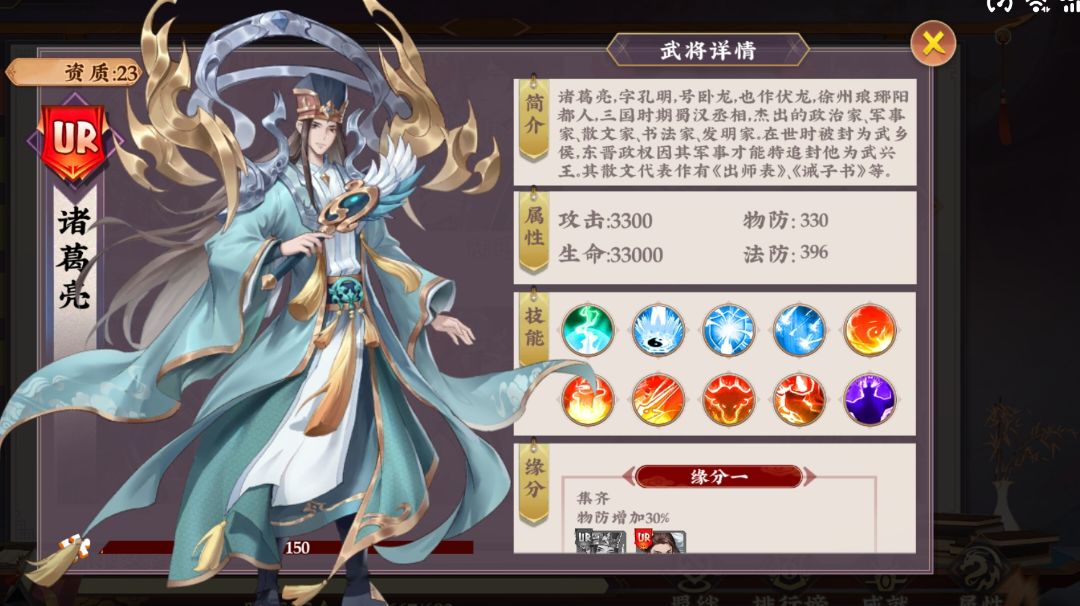 诸葛亮,品级UR,资质23 获取方法:限时神将活动,优惠转盘活动 诸葛亮可以说是最强输出,有了他极限培养,搭配最强前排关羽,就毕业了 简介:诸葛亮,字孔明,号卧龙,也作伏龙,徐州琅琊阳都人,三国时期蜀汉丞相,杰出的政治家,军事家,散文家,书法家,发明家,在世时被封为武乡侯,东晋政权因其军事才能特追封他为武兴王,其散文代表作有《出师表》、《诫子书》等。 下面是技能介绍: 卧龙天罚(一技能)加攻击和暴