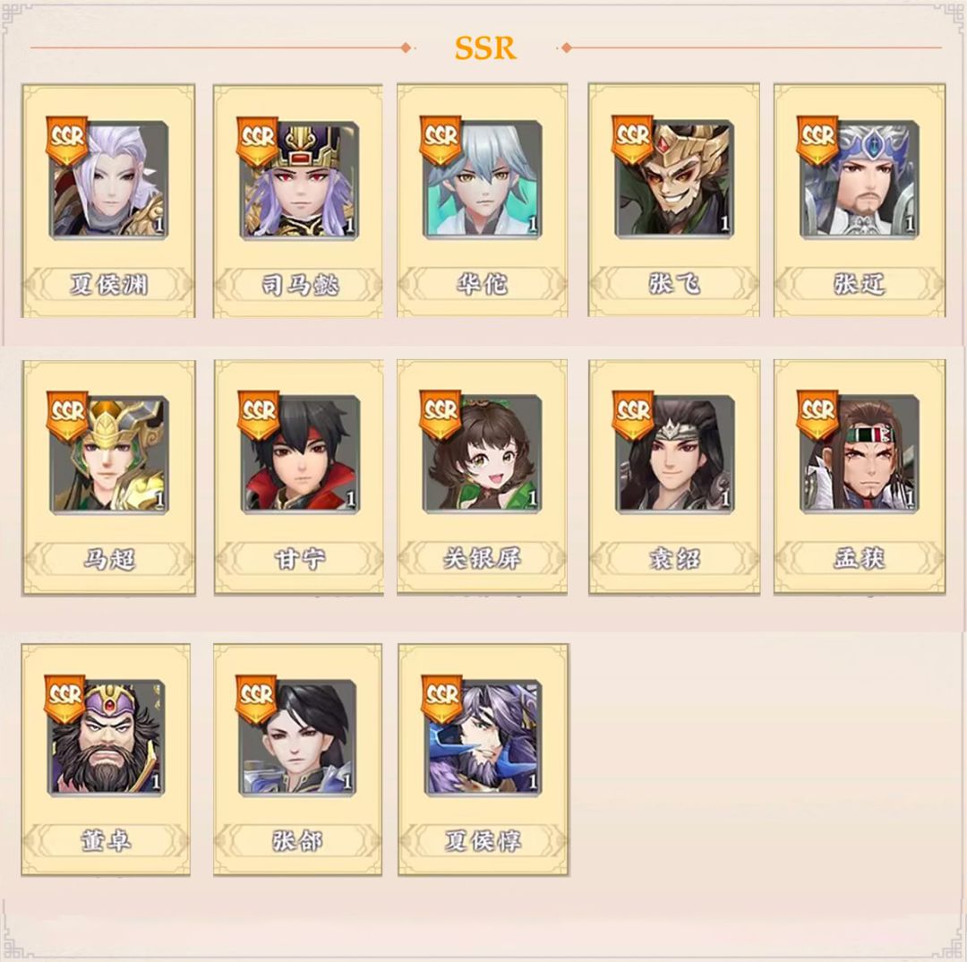 上一篇文章我们主要介绍了UR级神级。今天来看下SSR\SR\R三个等级的武将有哪些。 魏国SSR:夏侯渊、司马懿、张辽、张郃、夏侯惇 蜀国SSR:张飞、马超、关银屏 吴国SSR:甘宁 群雄SSR:华佗、袁绍、孟获、董卓 以上武将都可以通过酒馆招募获得。 魏国SR:无 R武将:曹仁 蜀国SR:无 R武将:张星彩 吴国SR:步练师、黄盖、太史慈 R武将:小乔 群雄SR:祝融 R武将:无 以上就是我们