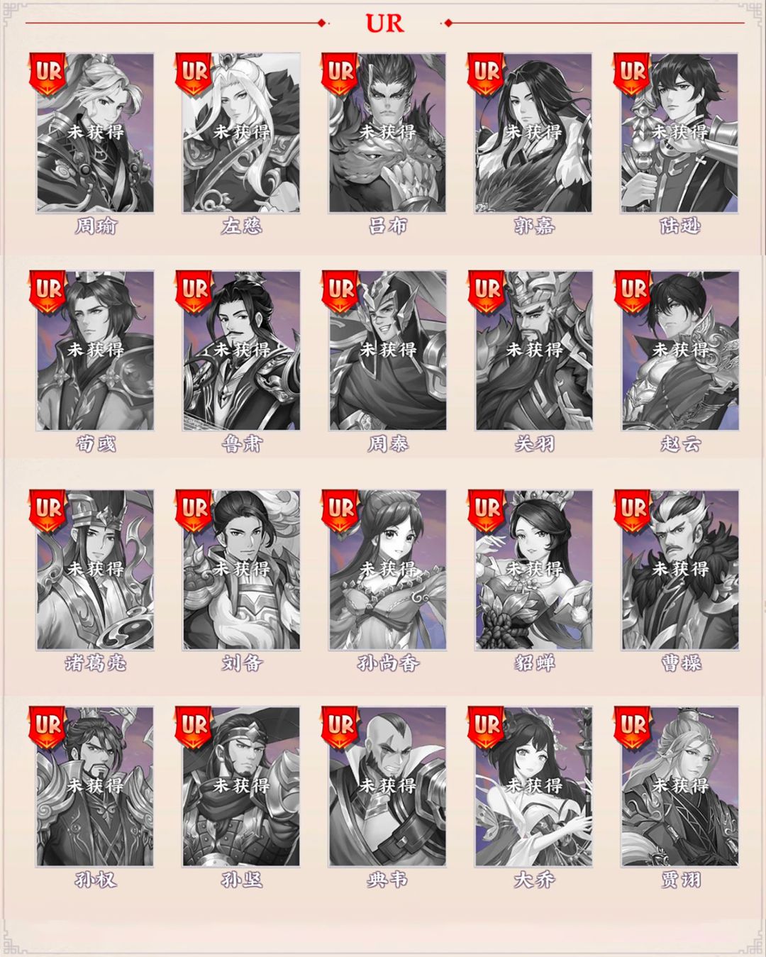 在《三国将无双》这款游戏中,我们邀请了来自三国时期的众多英勇将领,他们各怀绝技,勇猛无双。下面就让我们来认识有哪些武将吧!! 武将按照品质等级分为:UR-SSR-SR-R,一共4个等级。按照阵营分为:魏、蜀、吴、群4个阵营。 今天我们来看下UR将。共有20个,其中孙权、曹操、孙坚、孙尚香、贾诩这5个UR将,可以在酒馆中招募获得。剩下15个只能通过活动,关卡扫荡进行获得。 魏国UR:郭嘉、荀彧、曹