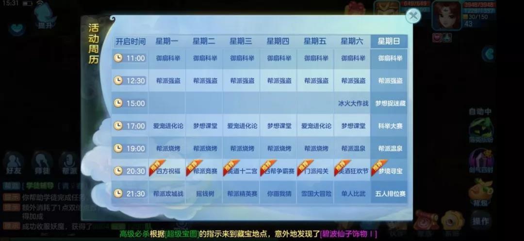 对于前期来说最主要的就是等级,做任务应该更倾向于经验的获取。小伙伴想要在有限的时间里获得更多的经验和奖励收益就要挑着各种好任务做了。下面给出一些推荐供小伙伴参考。 一、优先选择 参与活动:师门任务、任务链、寻宝任务、御扇科举、梦想课堂、爱宠进化论、迷宫、副本、运镖任务、宝图任务、丝绸之路、20:30活动。 分析: 这些任务都是最简单而且获得经验最高的任务,其中师门任务10分钟就能解决,经验收益最高