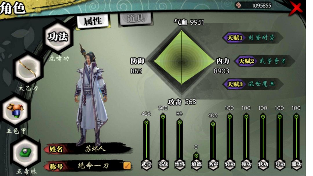 体验了一下朋友们所说的*版本,宗师难度起步,武功和心法太霸道了(有些更厉害)……只用无敌心法加大天自在掌(天王的专属武功,一招连击,二招内伤,三招几率连击自带霸体)…加上养成时间充足,通关一次即可达成的结局及通鉴事件。