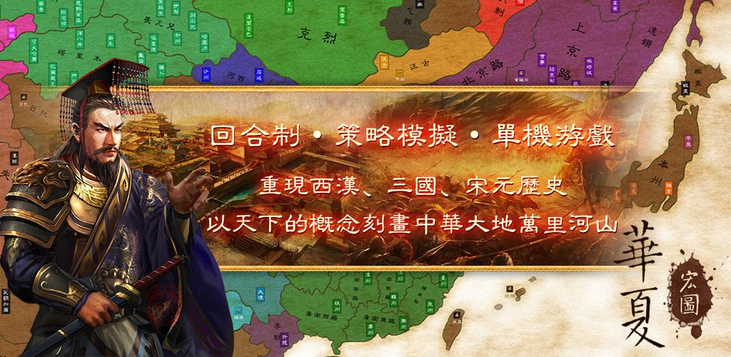 《华夏宏图》是一款国产的单机手游,作者是一个历史地理迷,也是某荣的SLG沉迷玩家。为了那点情怀和冲动,开发了一款以中国历史为背景的单机策略游戏。目前开发的剧本有《三国群雄》、《东汉远征》、《北宋-靖康耻》、《汉武帝-开疆拓土》、《南宋-苍狼白鹿》以及8个经典小战役官渡、赤壁、徐州、濮阳、汉中等。