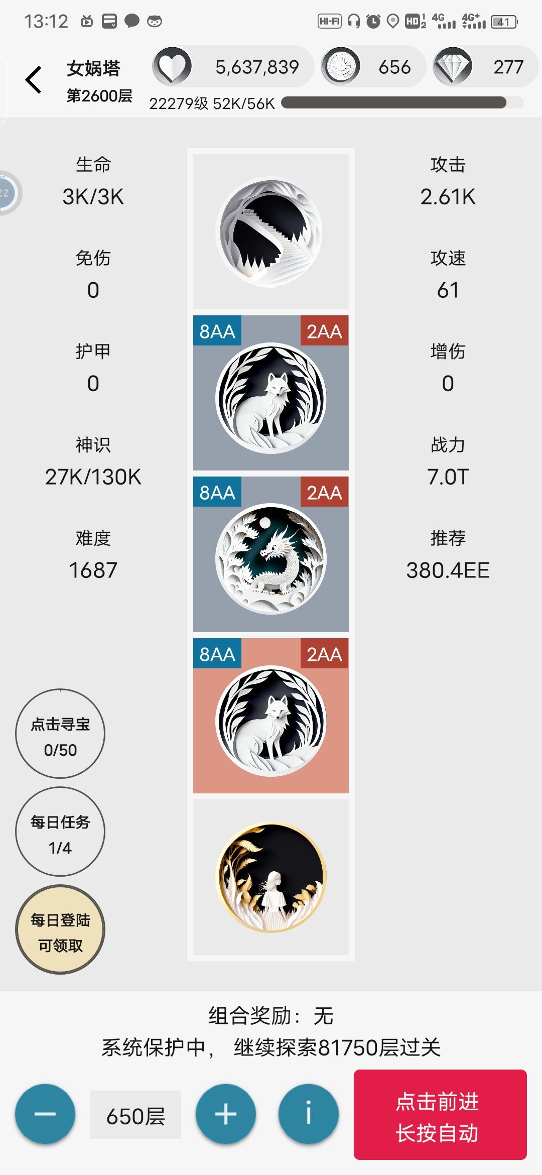 基本必过技巧:进去每次的层数倍率拉满,神识够200切回倍数1层,选基数最高的卡,选完切回你最高层数。 原理是切回1层那次升级的卡片收益还是按最高倍率的算,但升级才用200神识就够了。不懂这算机制还是bug 缺点:切回1层时碰到加体力的卡时会亏体力。 吐槽下这体力是真不够用,1层数靠寻宝才有点盈余。