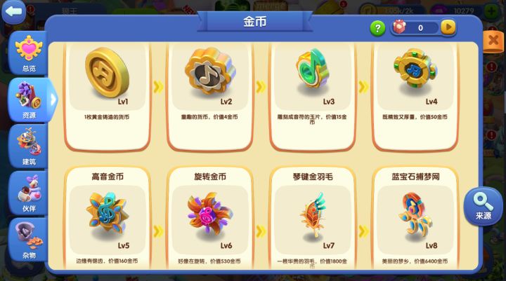 金币的作用非常大,可以购买可爱的娃娃,合成独具特色的高级工人,派遣工人进行资源的采集,加速建设家园。 温馨提示:3个小花娃娃可以合成1个新手花艺师,5个小花娃娃可以合成2个新手花艺师! 接下来我们一起了解下金币和它的获得方法: 金币一共有9个等级,可以通过低等级的金币合成出高等级的金币,合成规则与娃娃的合成规则相同,收集高等级金币可获得更多价值的金币。 金币的产出可以通过各种水果的合成