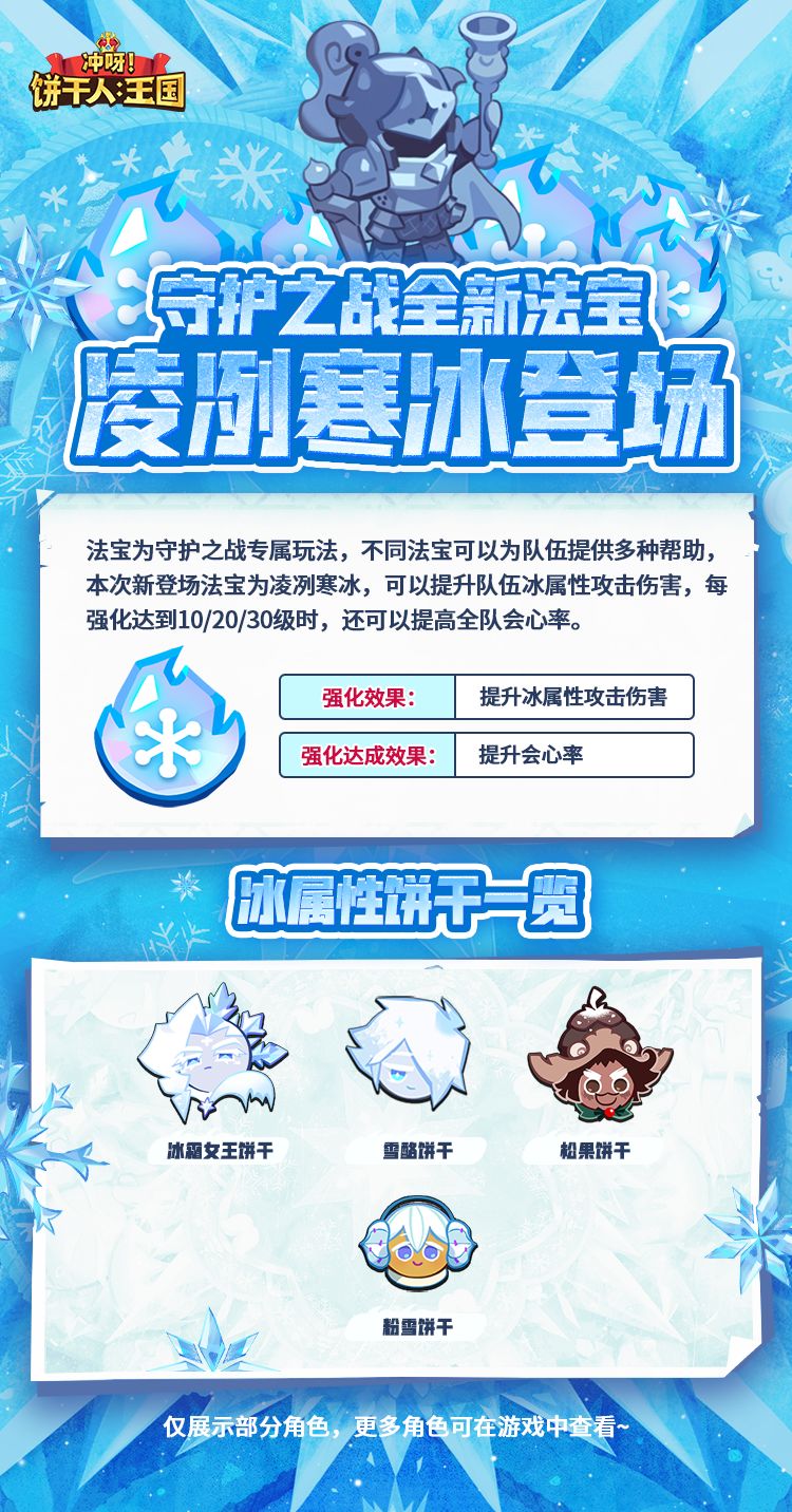伴随着雪酪饼干实装与冰霜女王饼干全新力量解锁,冰属性饼干正式登场。 守护之战凌冽寒冰现已实装,尽情一展身手吧!